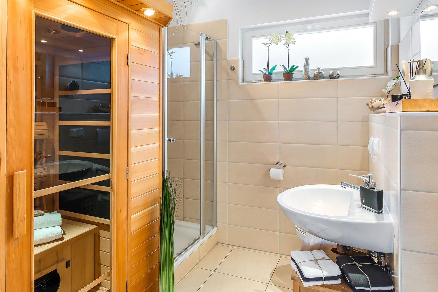Das stilvolle Badezimmer mit Tageslicht verfügt über eine eigene Infrarotsauna, Dusche, Waschbecken, WC, Föhn und Kosmetikspiegel.