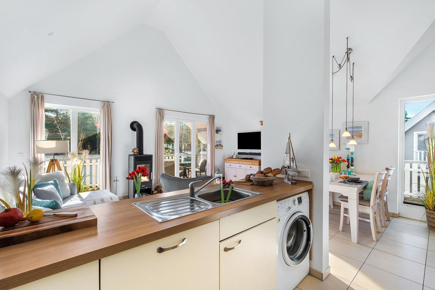 Die helle Nichtraucherwohnung mit kostenfreiem WLAN verfügt über eine voll ausgestattete offene Küche mit Geschirrspüler, Mikrowelle, Kaffeemaschine, Wasserkocher, Toaster, Kühlschrank mit Gefrierfach, 4-Felder Ceranherd mit Backofen sowie über eine Waschmaschine.