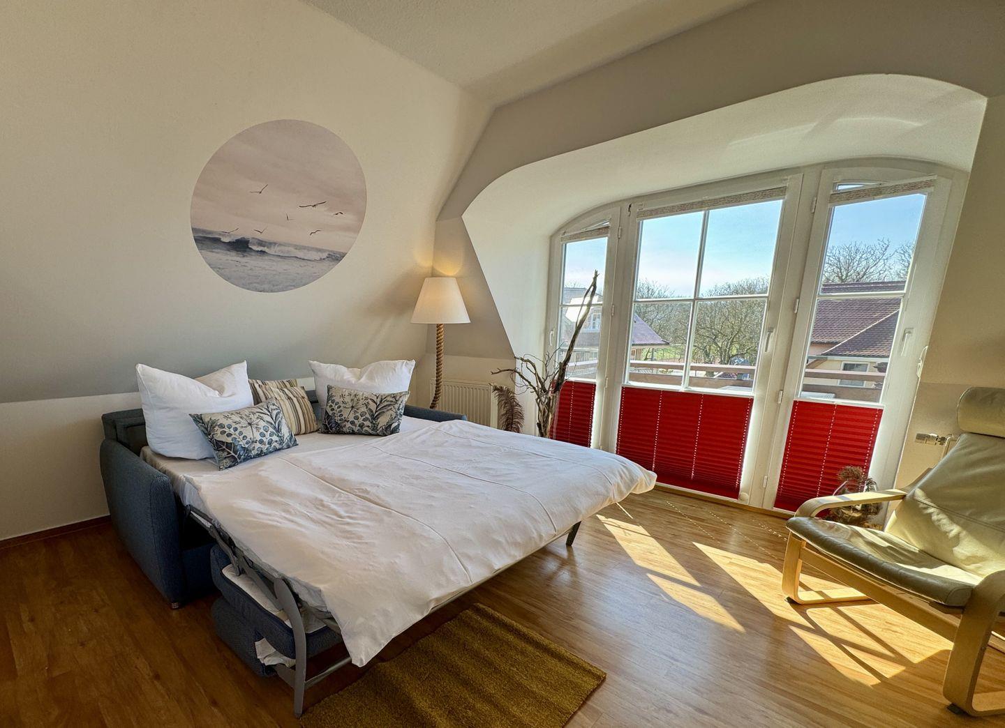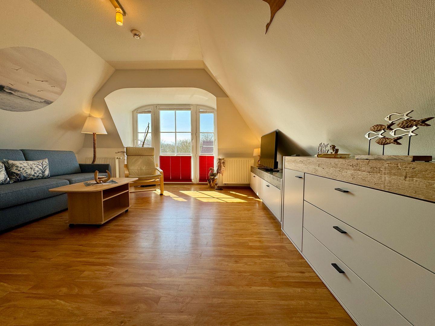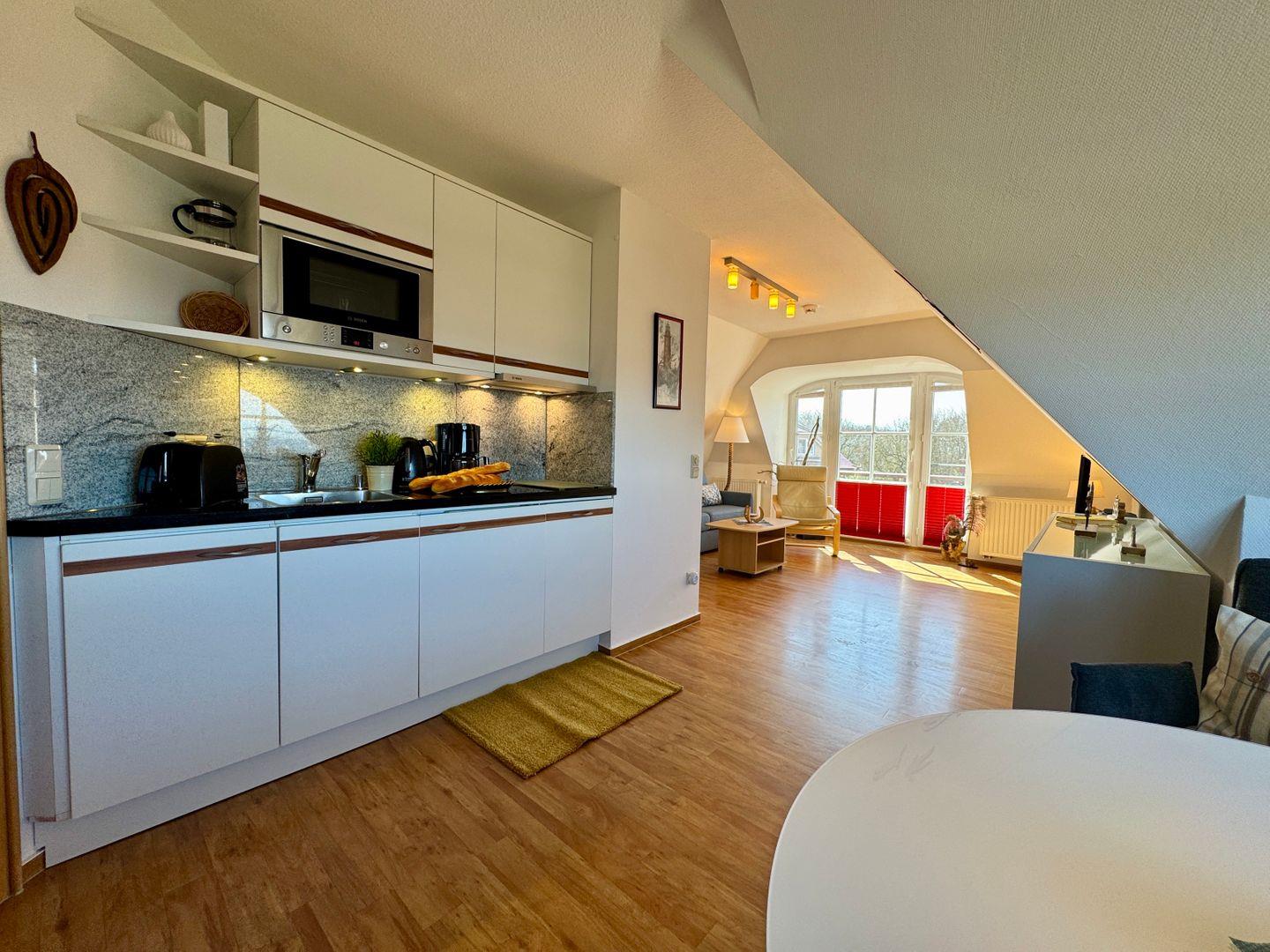 Ein Dachgeschoss-Appartement für maximal 2 Personen mit einem Süd-Ost Balkon und Blick auf die Ost-see. Das Appartement umfasst einen kombinierten Wohn- und Schlafbereich mit einer Schlafcouch und einer Pantry-Küche. Das Badezimmer ist mit Dusche und WC ausgestattet. Haustiere sind gestattet. Das Rauchen ist nicht gestattet, jedoch gibt es WLAN für einen bequemen Internetzugang während des Aufenthalts. Diesem Appartement ist der Tiefgaragenstellplatz Nr. 10 zugeordnet.