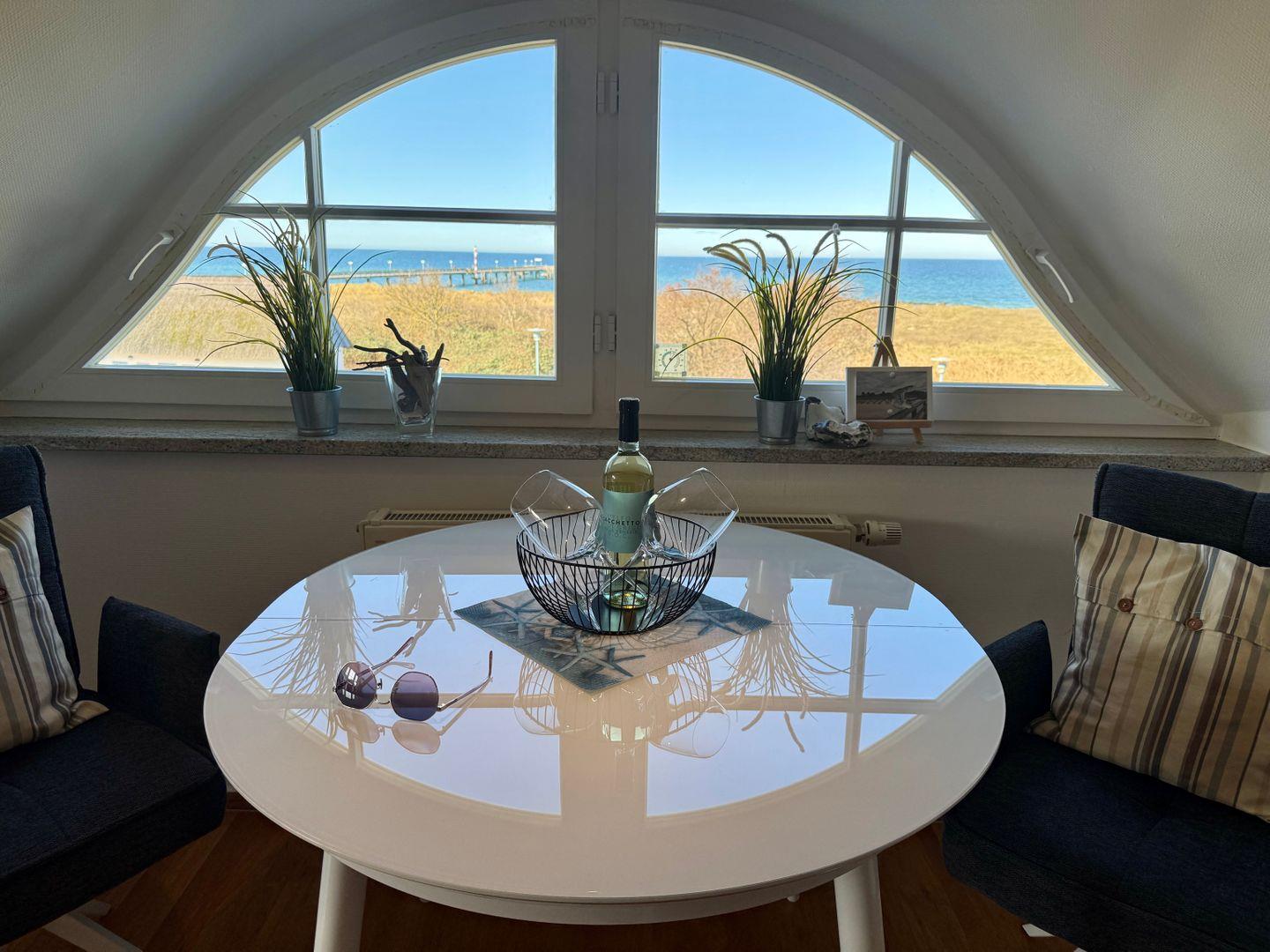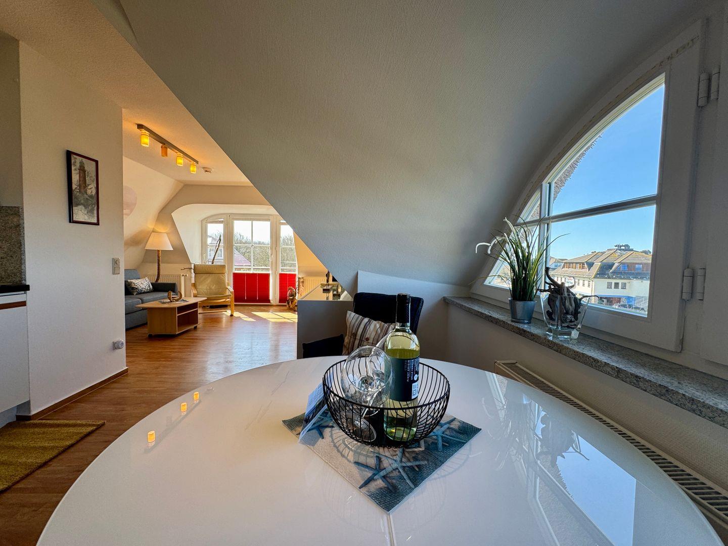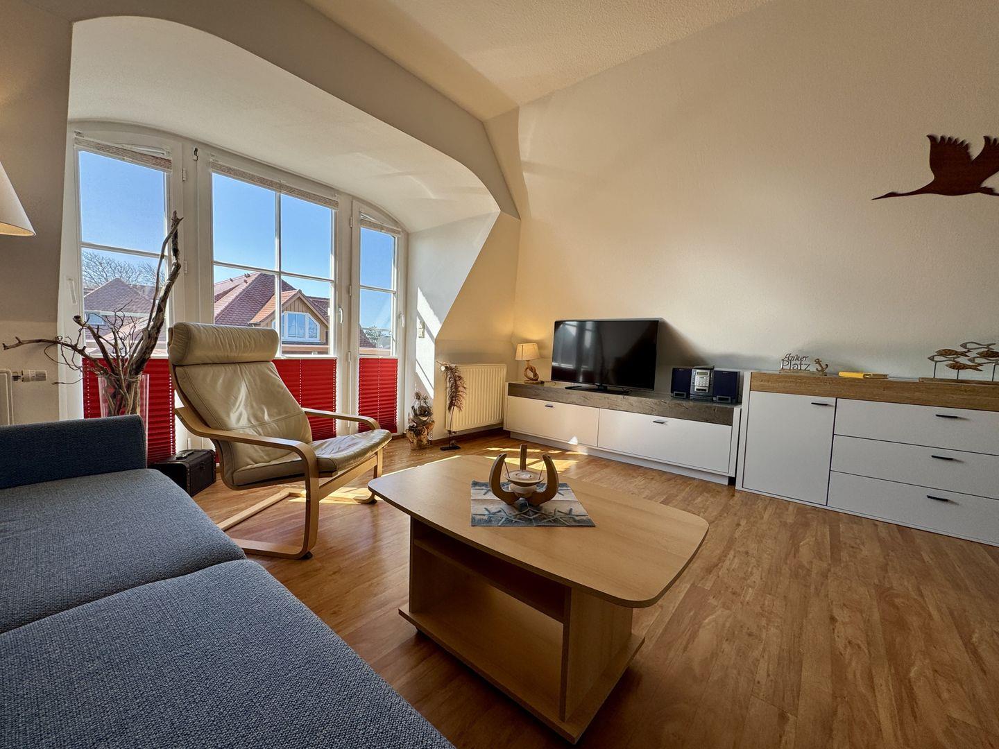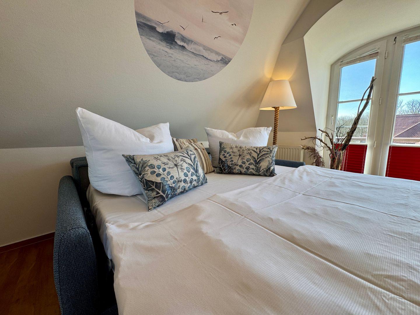 Ein Dachgeschoss-Appartement für maximal 2 Personen mit einem Süd-Ost Balkon und Blick auf die Ost-see. Das Appartement umfasst einen kombinierten Wohn- und Schlafbereich mit einer Schlafcouch und einer Pantry-Küche. Das Badezimmer ist mit Dusche und WC ausgestattet. Haustiere sind gestattet. Das Rauchen ist nicht gestattet, jedoch gibt es WLAN für einen bequemen Internetzugang während des Aufenthalts. Diesem Appartement ist der Tiefgaragenstellplatz Nr. 10 zugeordnet.