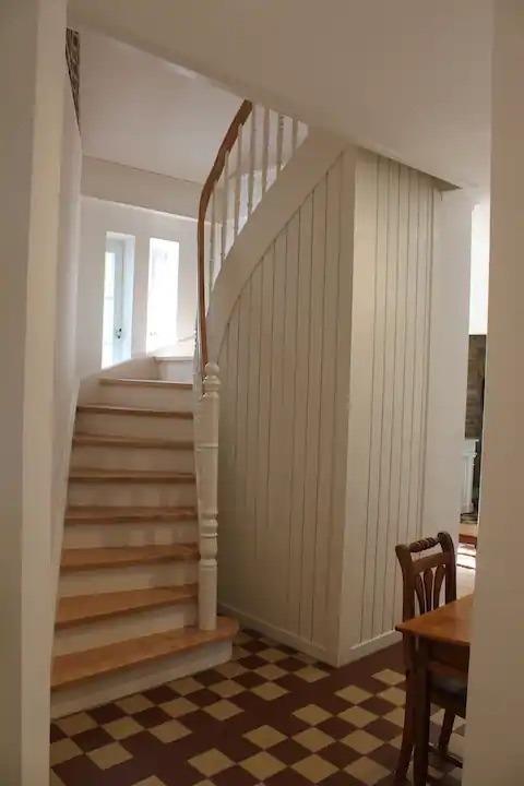 über einen separaten Eingang betreten und verfügt zur alleinigen Nutzung über ein Erdgeschoss mit Wohnräumen und Küche, sowie Bad und ein Obergeschoss mit Schlafräumen und WC .