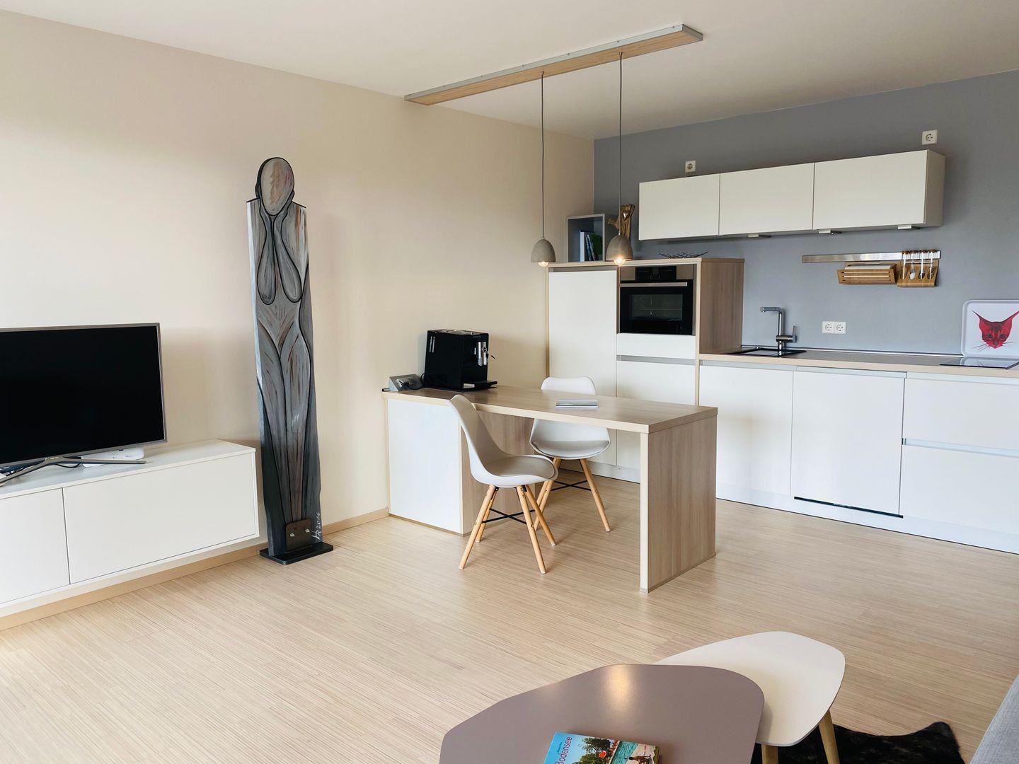 Das helle Wohn- und Esszimmer beeindruckt mit einer gemütlichen Sofaecke, die auch als Schlafcouch genutzt werden kann. Große Glasfronten bieten einen beeindruckenden Blick auf die Terrasse, die ein idealer Lieblingsplatz für entspannte Momente im Freien wird. Die offene und gut ausgestattete Einbauküche verleiht Ihnen die Unabhängigkeit, kulinarische Köstlichkeiten zuzubereiten, während Sie auch die verschiedenen Restaurants in der näheren Umgebung erkunden können.
