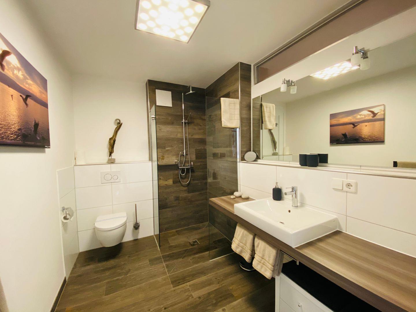 Für geruhsame Nächte steht ein Schlafzimmer mit einem großzügigen Doppelbett und einem zusätzlichen Fernseher zur Verfügung. Das Badezimmer mit bodentiefer Dusche erinnert an ein eigenes Day-Spa, in dem Sie sich nach einem erlebnisreichen Tag entspannen können.