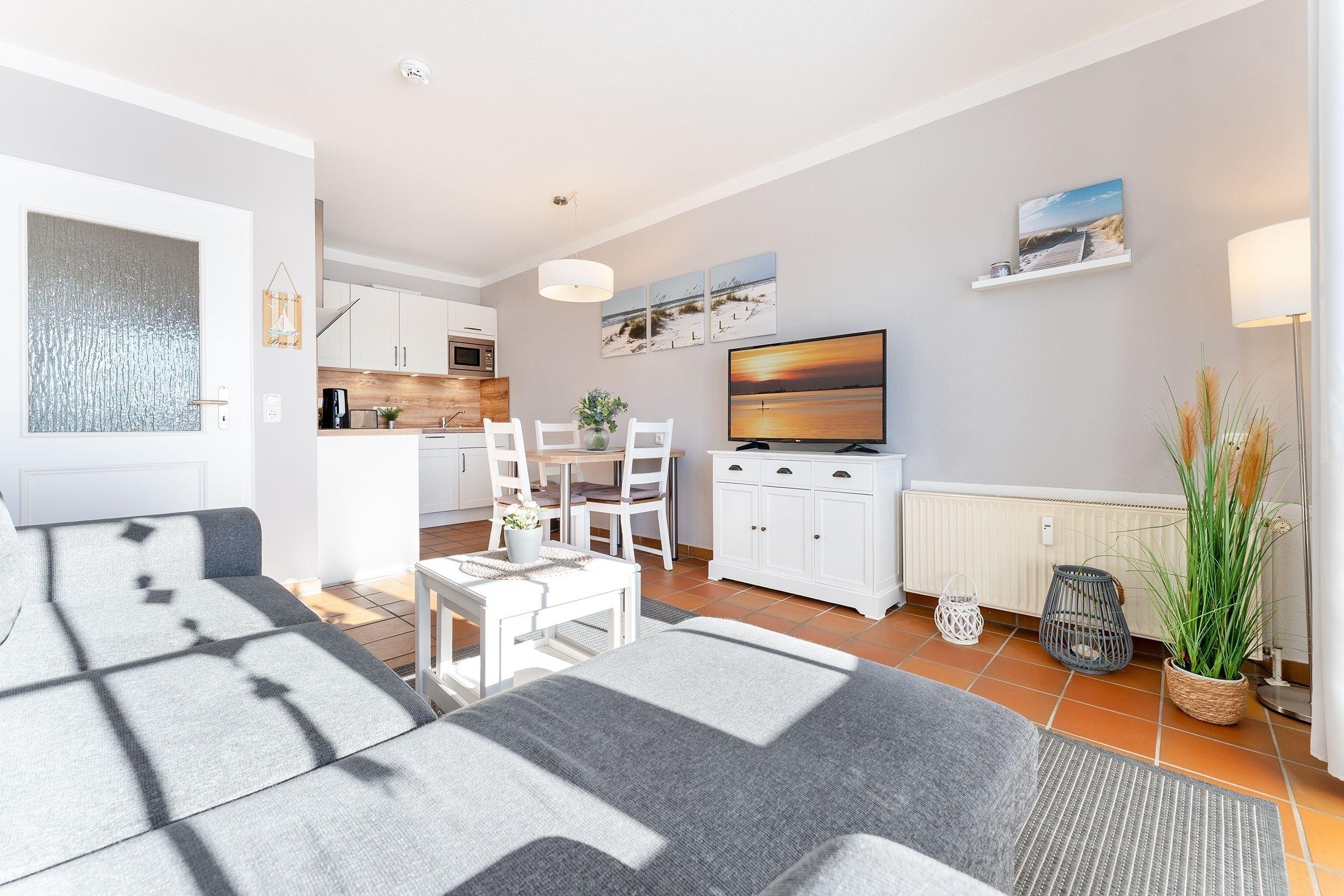 Herzlich willkommen im Urlaub! Vom lichtdurchfluteten, liebevoll eingerichteten Wohnbereich mit TV-Ecke führt ein direkter Zugang zum Balkon. Dieser ist zur Sonnenseite ausgerichtet mit Blick auf den malerischen Großen Pönitzer See. Die in den Wohnbereich integrierte, offene Küche ist mit einem gemütlichen Essplatz ausgestattet. Das Schlafzimmer ist mit einem bequemen Doppelbett (180x200 cm) und einem geräumigen Kleiderschrank möbliert, im Wohnzimmer lässt sich die Couch in ein Doppelbett (160x180 cm) umfunktionieren. Das Duschbad ist hell gefliest.