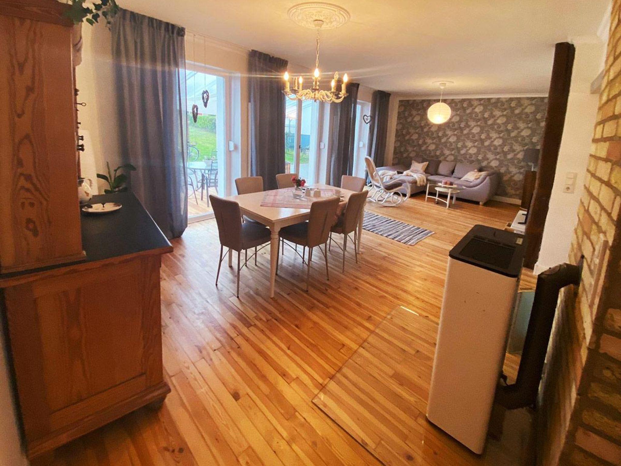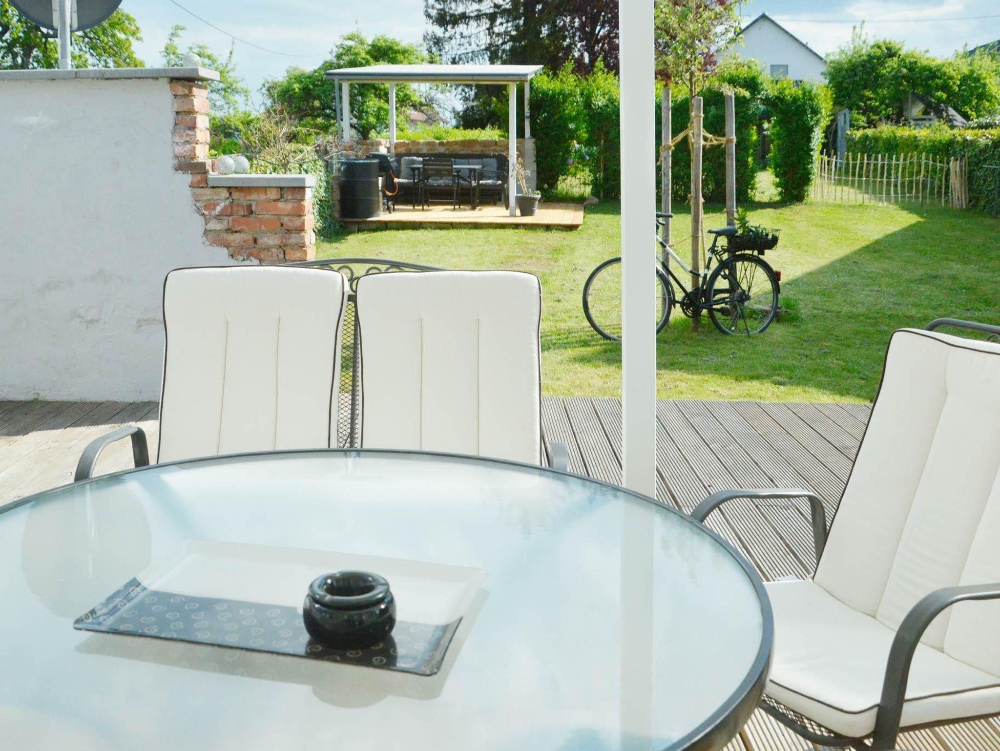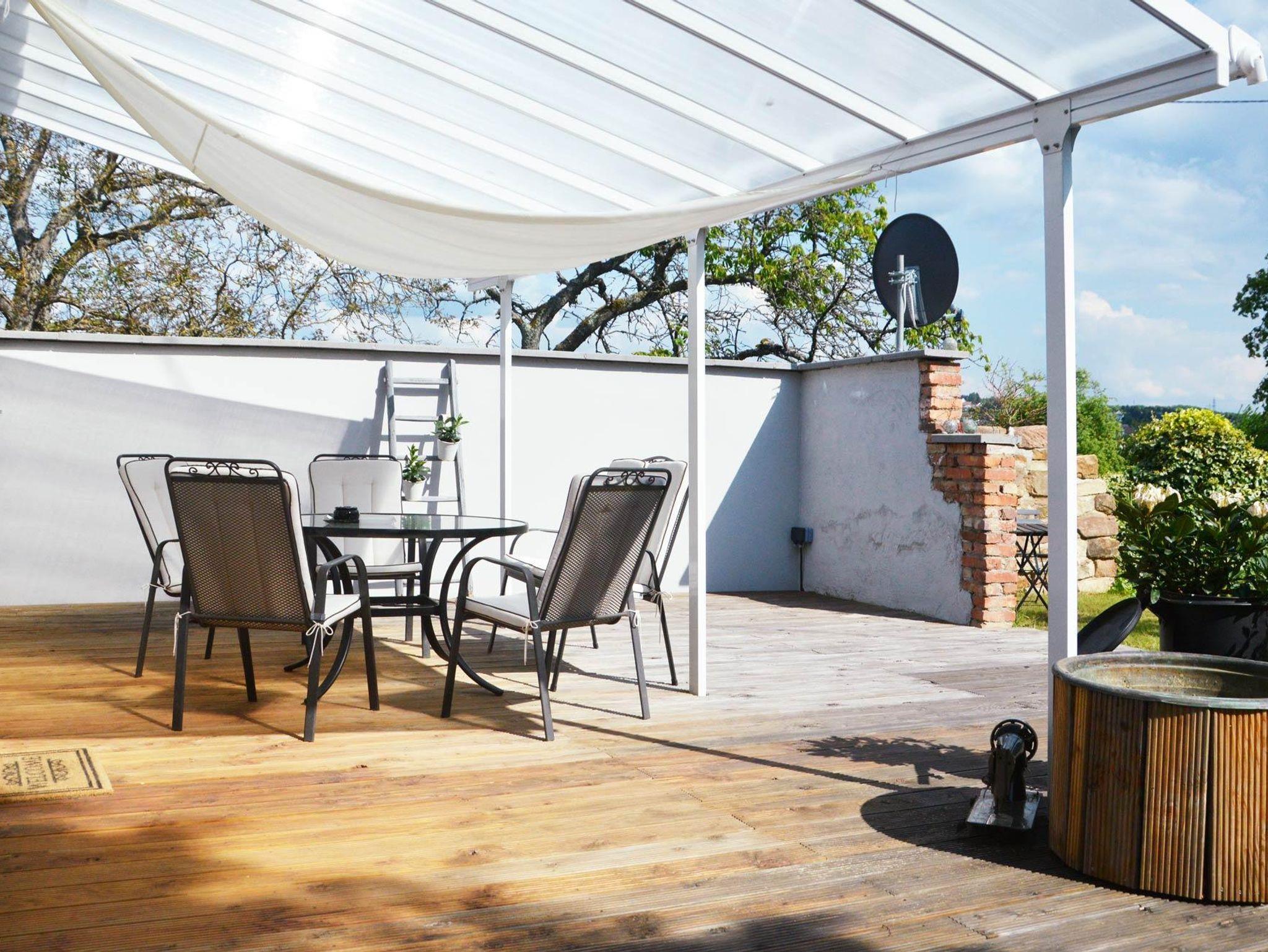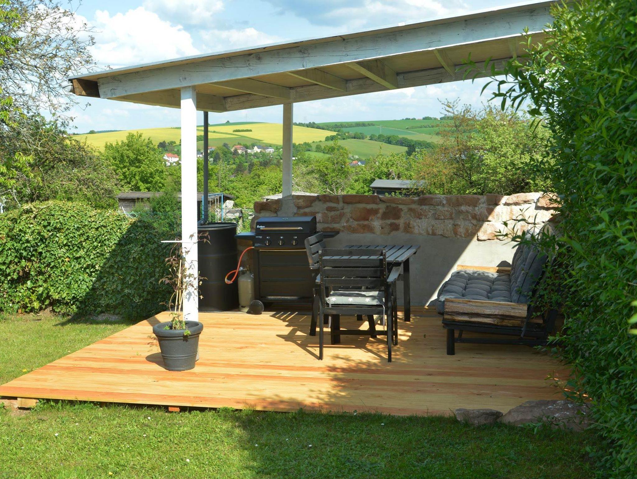 Garten hinter dem Haus mit überdachtem Grillplatz. Parkplätze, WLAN, Bettwäsche und Handtücher im Preis enthalten. Babybett und Hochstuhl vorhanden.