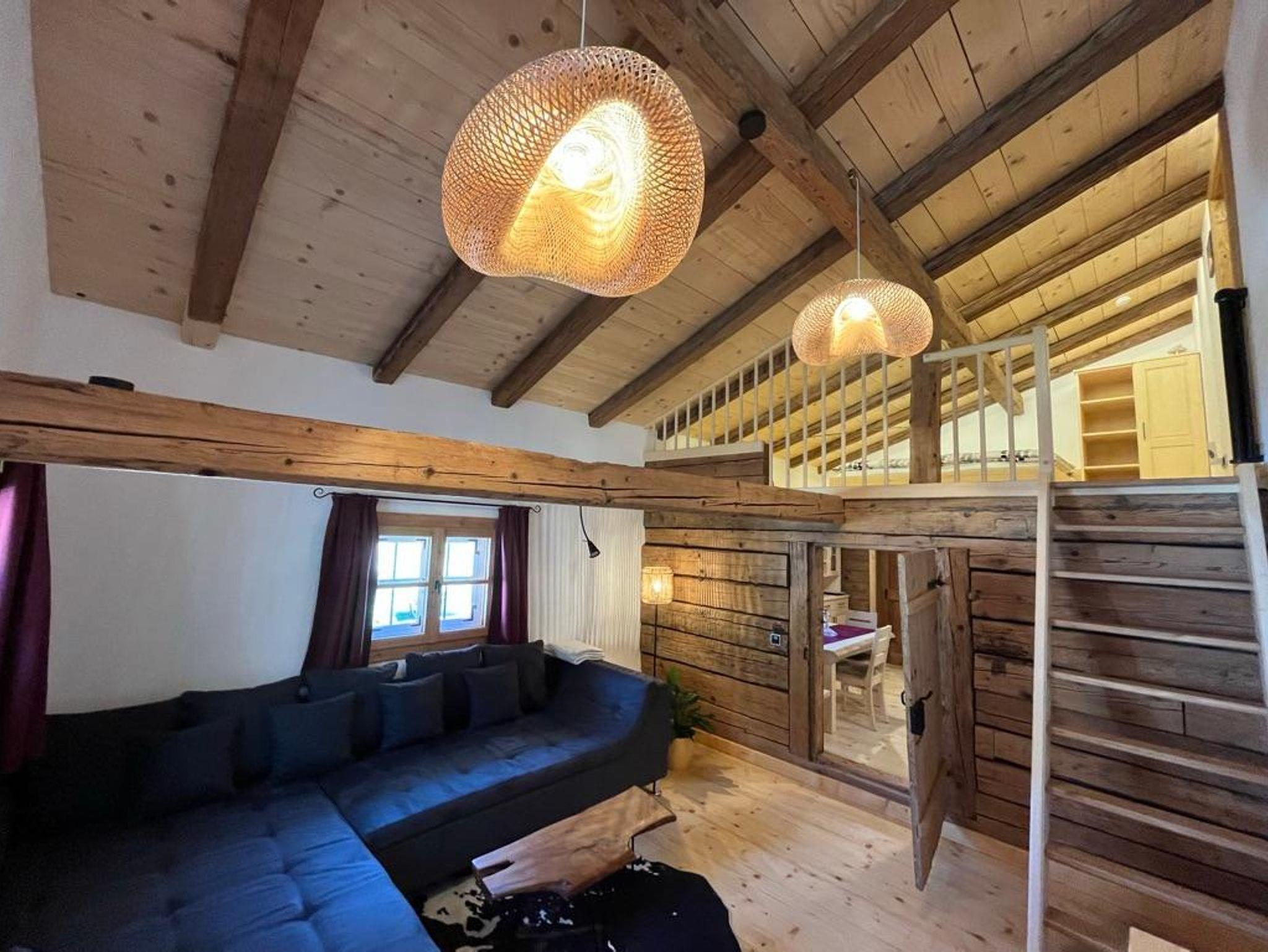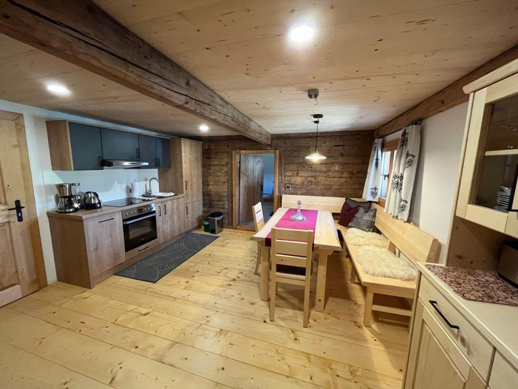 Das größte Apartment bietet Platz für 4 Erwachsene und erstreckt sich über die gesamte Länge des Hauses. Durch eine Veränderung der Raumaufteilung bietet sich Platz für ein Wohnzimmer, Schlafzimmer und eine Küche. Die große Eckbank in der Küche lädt zu einer gemütlichen Runde mit bayerischem Spezialitäten ein! Das Wohnzimmer wurde bis zum Dachstuhl geöffnet und ermöglicht über eine Treppe den Zugang zur Galerie. Hier steht ein weiteres Doppelbett und alternativ ein Matratzenlager für mehrere Kinder zur Verfügung. Ebenso sorgt die Beleuchtung für ein uhriges Heutstadl-Gefühl!