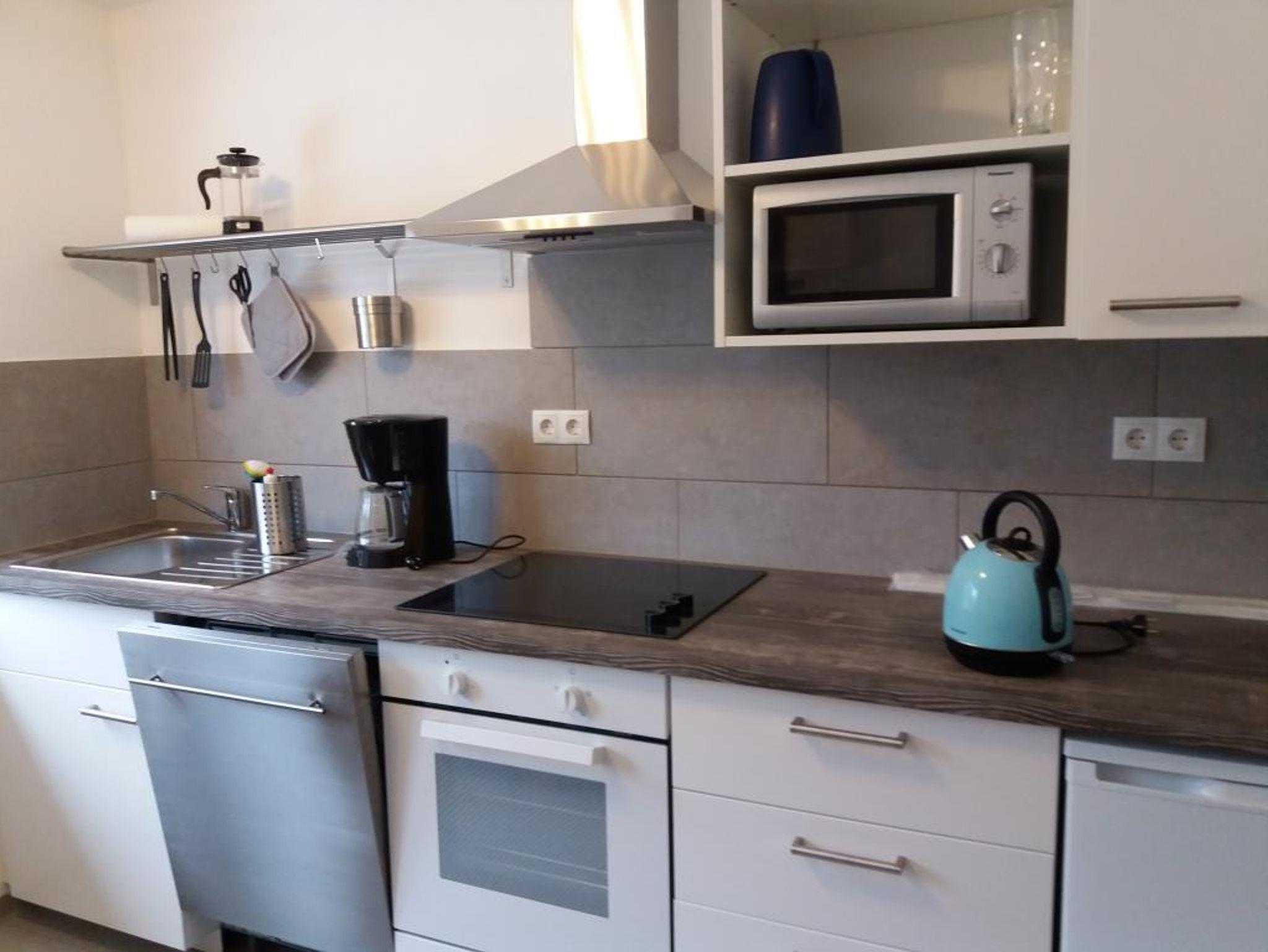 Einbauküche, Ceranfeld, Ofen, Mikrowelle, Dunstabzug, Wasserkocher, Kaffeemaschine, Spülmaschine, Kühlschrank, Waschmaschine