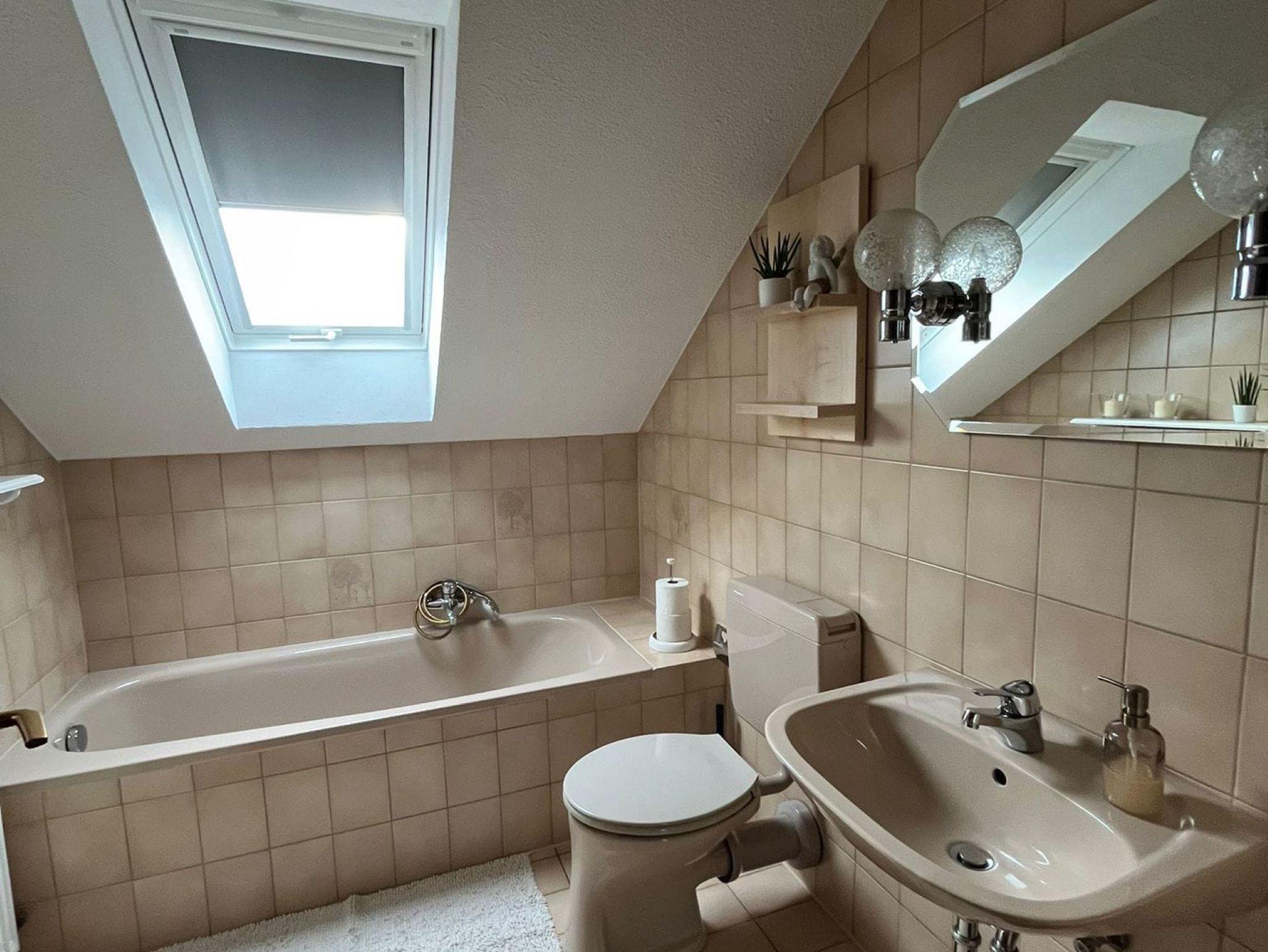 Das Badezimmer verfügt über ein WC, ein Waschbecken und eine Badewanne zum entspannen.