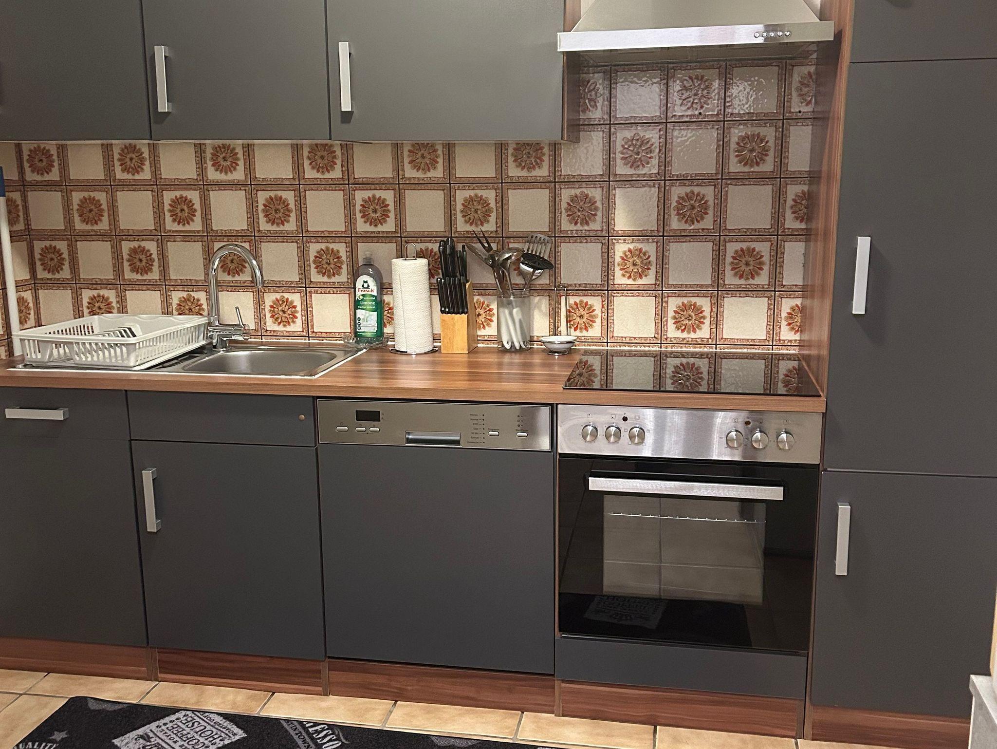 - Küche mit Kaffee-Pad-Maschine, Mikrowelle, Toaster, Herd, Backofen, sämtlichem Küchengeschirr,