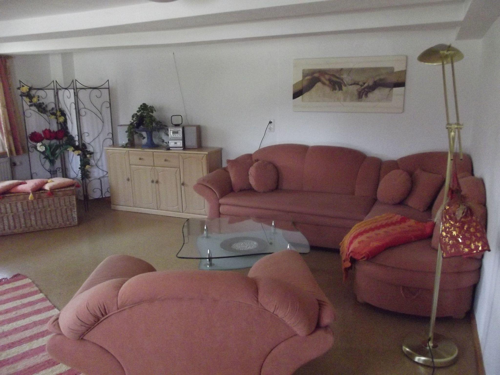 The apartment of around 70m² has a light and inviting interior and is in a quiet location with a beautiful view. It provides tastefully furnished rooms with all contemporary amenities and modern comfort. The generous living room has a corner sofa bed for two people (140cm wide), an armchair, a coffee table, a TV with a DVD player and a stereo system with a CD player. The separate kitchen is equipped with an oven, a stove, a fridge with a freezer compartment, a dishwasher, toaster, kettle, filter coffee machine and a bench with a dining table and chairs. The bedroom is furnished with a double bed (200cm wide). The bathroom has a shower, toilet, washbasin and hairdryer. There is also a guest WC with a toilet and washbasin. You can use a stepper and a fitness bike free of charge. The owner can provide a cot and a highchair free of charge. All rooms have heating and free Wi-Fi.