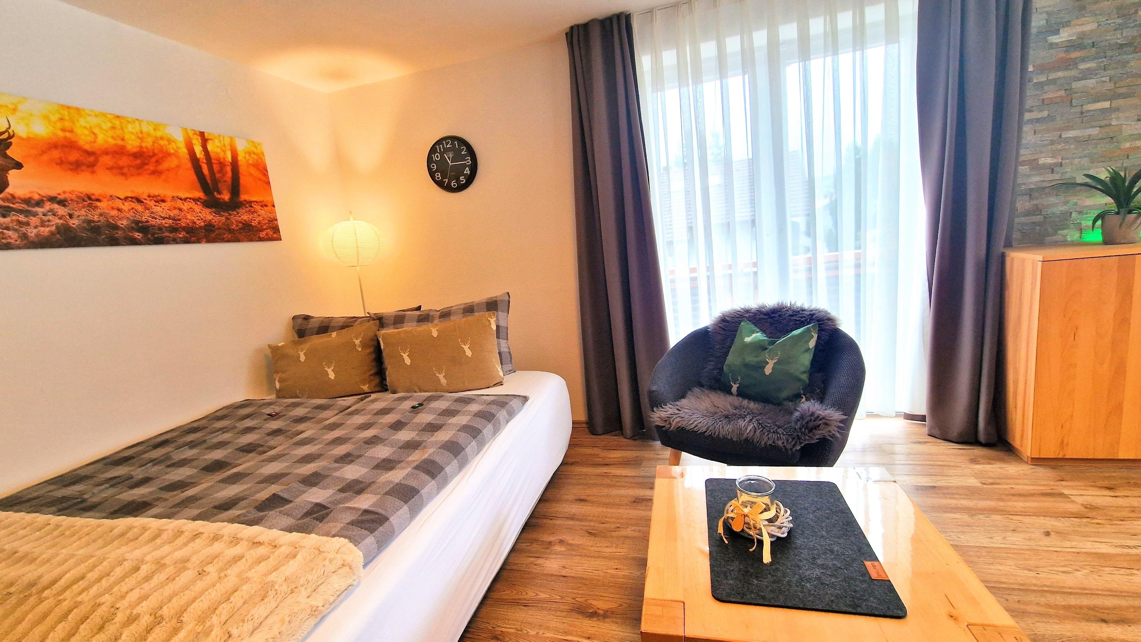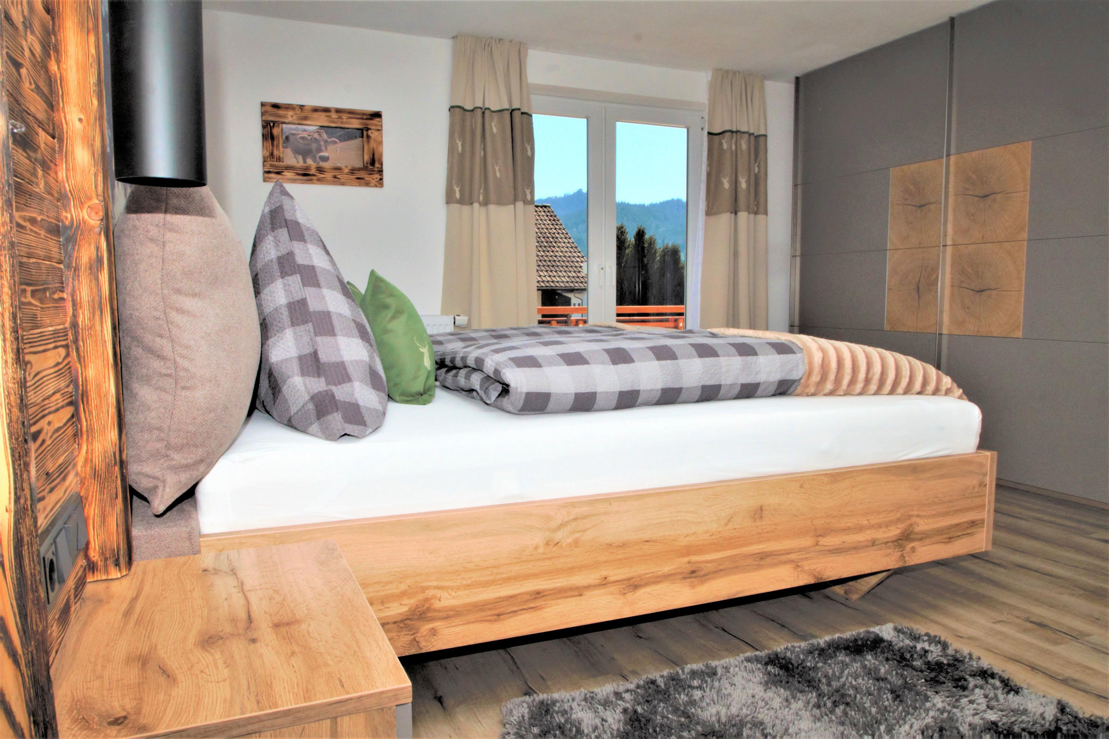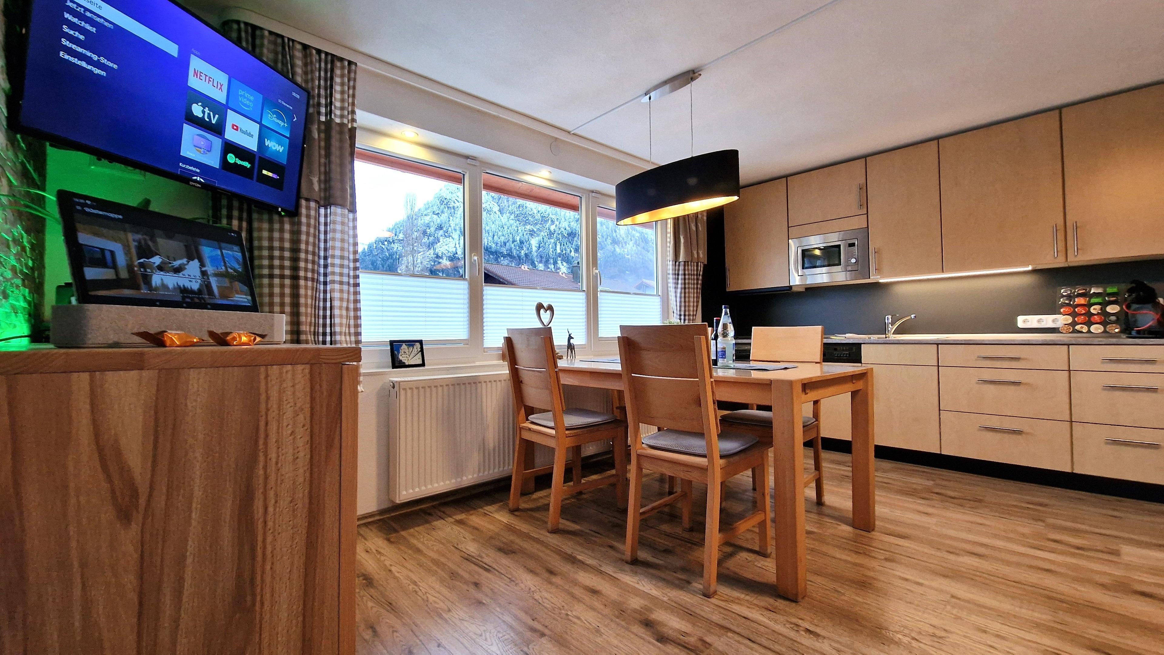 Zur Wohnung gehören ein Schlafzimmer (auf Wunsch mit einem Babybett), ein Wohnraum mit Küche, einem großen Essbereich, einem Smart Flachbild-TV und entweder einem Schlafsofa oder einem Zustellbett. Ein kleines Badezimmer, ein separates WC, ein großer Ost-Balkon mit Bergblick sowie kostenloses schnelles WLAN und eine Ski- und Fahrradgarage sind ebenfalls vorhanden. Vom Balkon aus können Sie den Blick auf die Pfrontener Berge genießen. Die Wohnung erwartet Sie im modernen Stil, mit vielen Details aus dem schönen Allgäu.