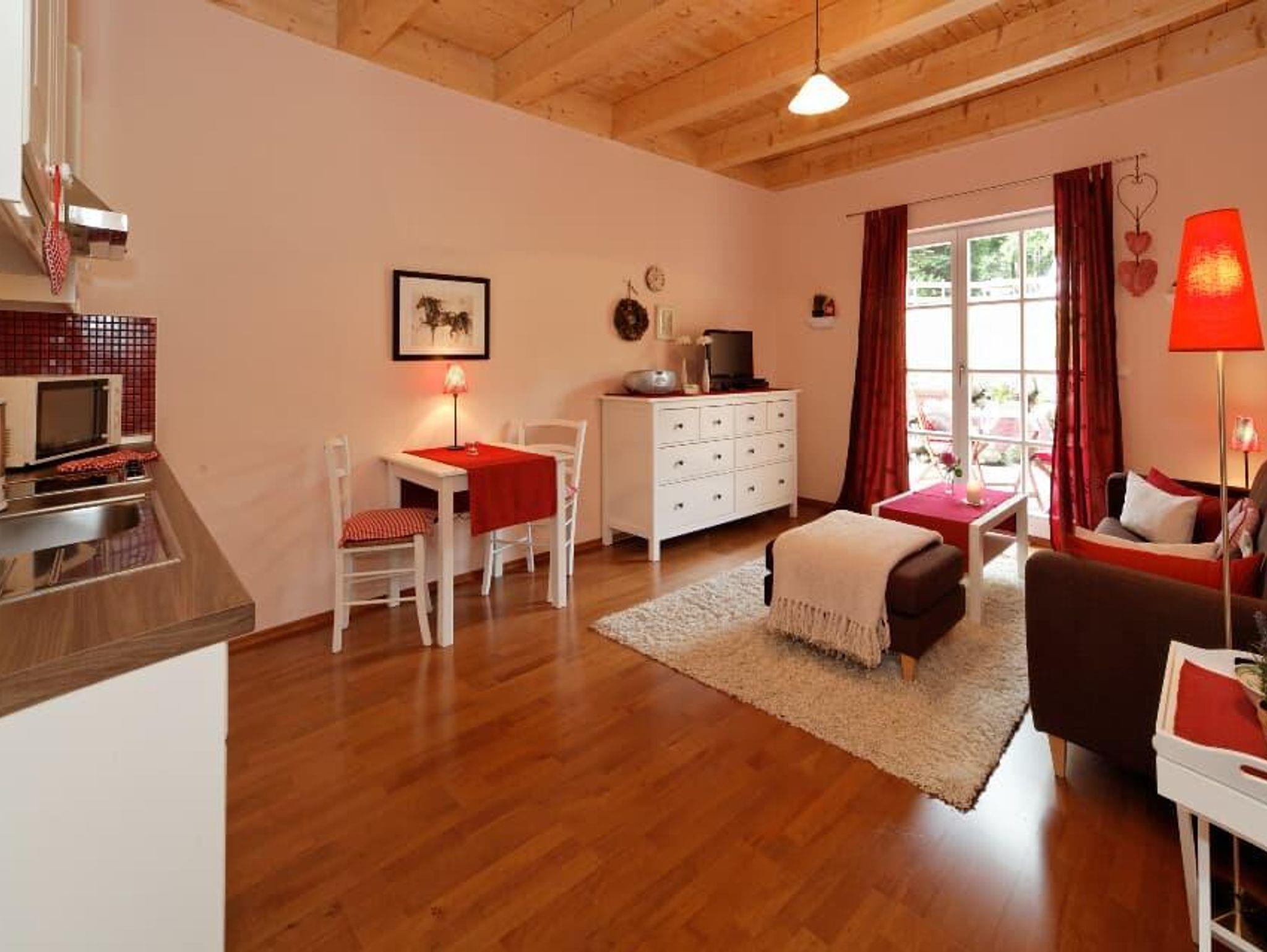 Die Wohnung Nesterl mit 40 qm und großer Terrasse, liegt in unserem neuen Bioholzhaus, gleich neben HerzigS Ferienhaus-Mitterdor. Sie finden einen großzügigen Wohnbereich mit gemütlilcher Sitzecke, Flachbild-Sat-TV, Radio/CD-Player, Radiowecker, kleine Essecke mit zwei Stühlen, Küchenzeile mit kl.Ceranfeld, Backofen, Micro, Kaffeemaschine, Wasserkocher, Toaster, Mixer, Eierkocher, Kühlschrank, reichlich Geschirr-u.Küchenuntensilien. Das kleine romantische Schlafzimmer hat ein Doppelbett (160x200 cm) mit 2 erstklassigen Matratzen und Bettenausstattung, schöne Bettwäsche, großen Schrank und Spiegel, im Badezimmer finden Sie eine große Flachduschwanne mit Glastüren, WC, Badmöbel mit Waschbecken, großen Spiegel, Handtuchwärmer, Fön, reichlich Hand-u.Badetücher und Bademäntel, im großen Eingangsbereich finden Sie noch eine Garderobe und Gartenmöbel auf der Terrasse (großen Sonnenschirm mit Tisch, Stühle u.Liegen) Außerdem hat diese Wohnung einen WLan Zugang.