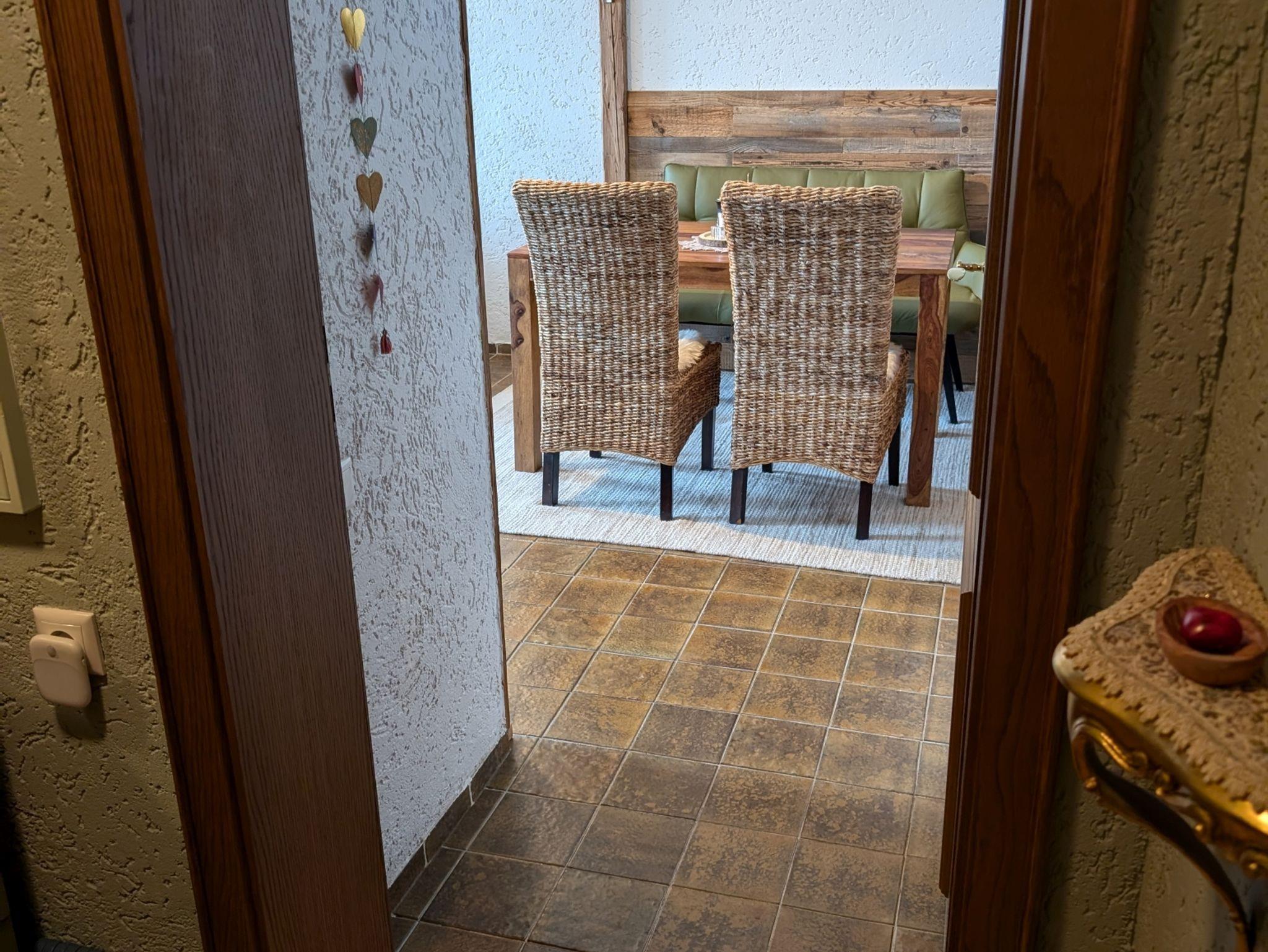Die Wände im Essbereich sind mit gemütlichem Altholz verkleidet. Der Esstisch, zwei Stühle sowie eine moderne Ledersitzbank bieten viel Platz für mindestens vier Personen.