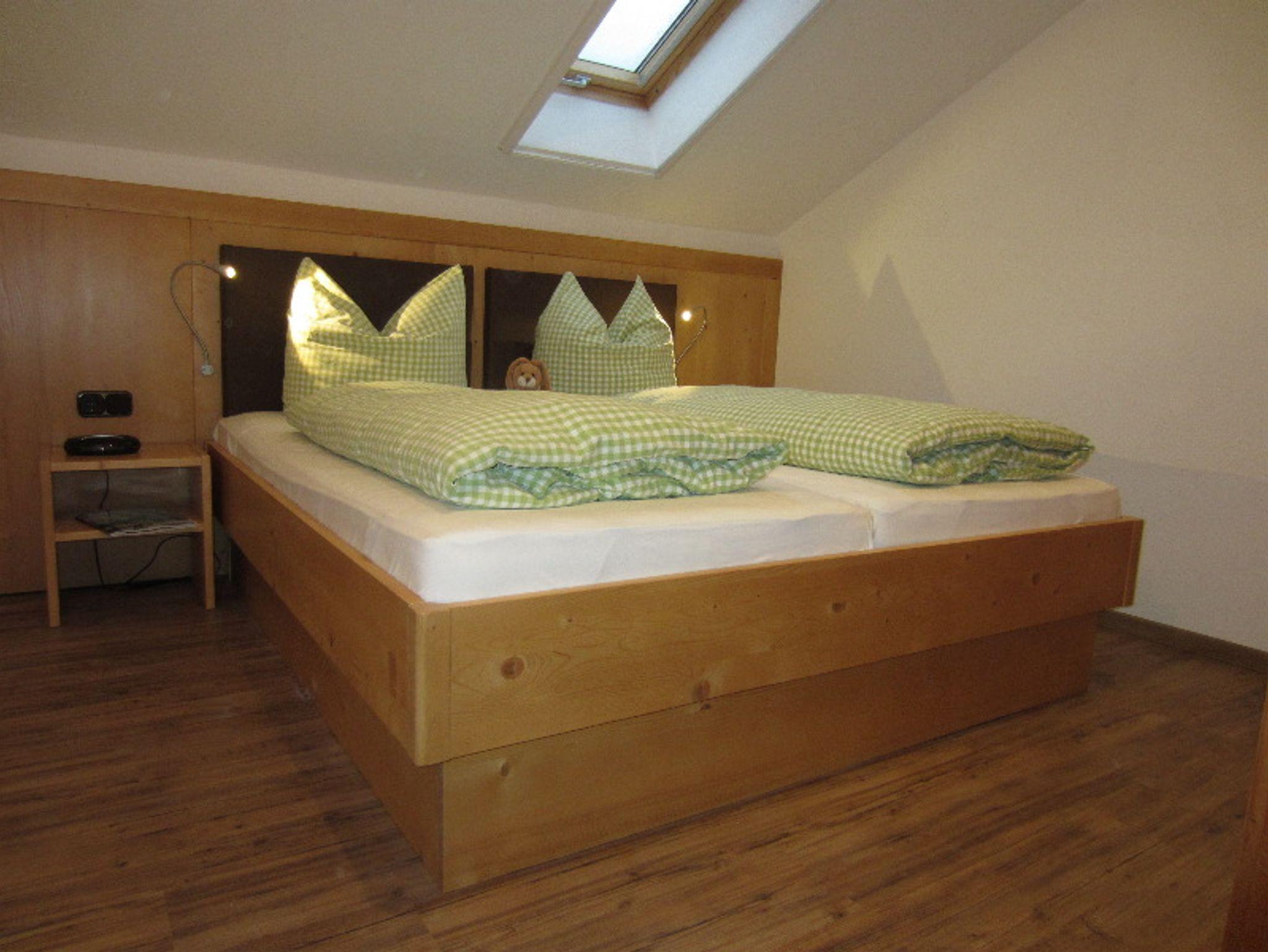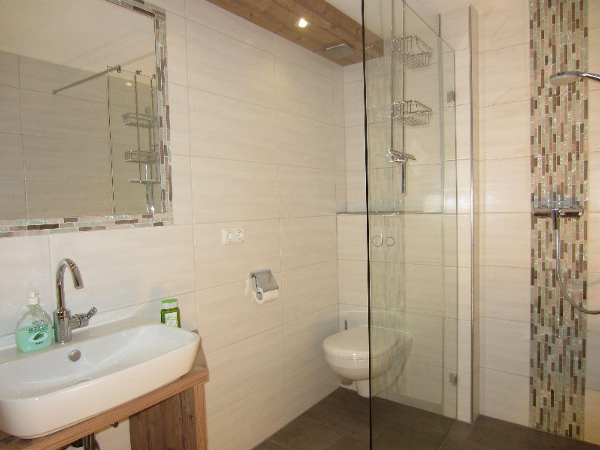 Die Ferienwohnung im zweiten Stock mit Wohnküche, zwei Schlafzimmern mit Doppelbetten (eines mit zusätzlichem TV), Bad mit ebenerdiger Dusche, Waschbecken, und WC sowie Balkon mit traumhafter Aussicht hat 67 qm² Wohnfläche. In der Wohnküche ist eine sehr bequeme Eckbank, eine Couch vor der rustikalen Holzwand, Fernseher und die Stereoanlage. Die Küche ist mit Spülmaschine, Induktionskochfeld, Backofen, Kühlschrank, Kaffeemaschine, Wasserkocher, Toaster, Erstausstattung mit Spültuch, Tabs und Mülltüten ausgestattet. Im Bad ist eine ebenerdige Dusche, Waschbecken und WC, Handtuchtrockner, Schminkspiegel, Handtücher und ein Föhn.