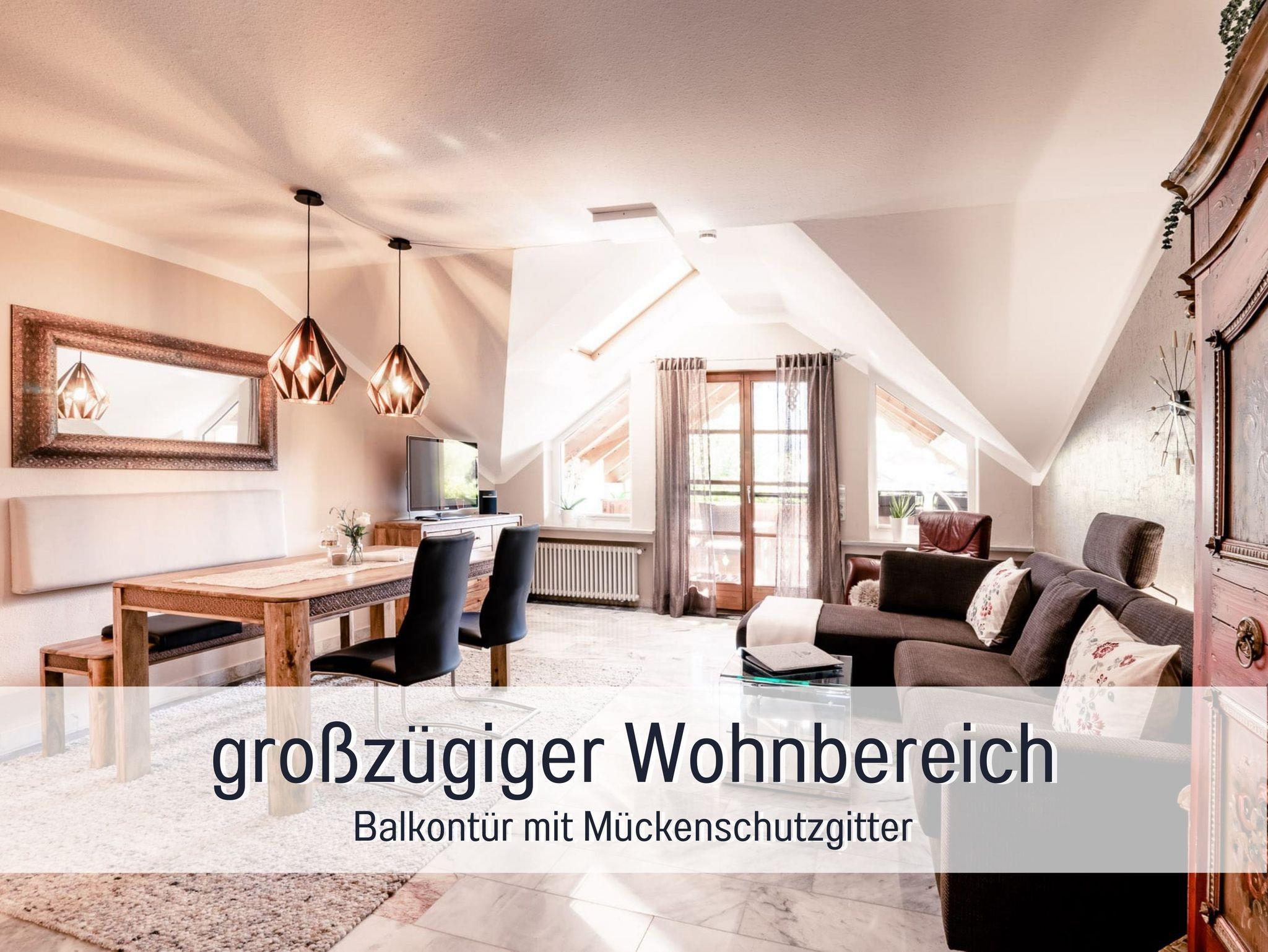 Schicke, moderne 5-Sterne Ferienwohnung Schlossblick (61 m²) für 2 Personen mit malerischem Ausblick auf das Schloss Staufeneck und den Hochstaufen, mit Schlafzimmer, Küche, Wohnzimmer, Dusche/WC und Balkon. Der große und überdachte Balkon ist zum Westen ausgerichtet - ideal, um den Tag mit einem gemütlichen Frühstück zu beginnen oder ihn bei einem Glas Wein ausklingen zu lassen. Um Ihren Aufenthalt perfekt zu machen, gehören kostenloses WLAN/WiFi sowie ein Bluetooth-/Internet-Radio ebenfalls zur Ausstattung. Für Ihren ungestörten Schlaf wurden die Fenster größtenteils mit Insekten-Schutzgittern ausgestattet.
