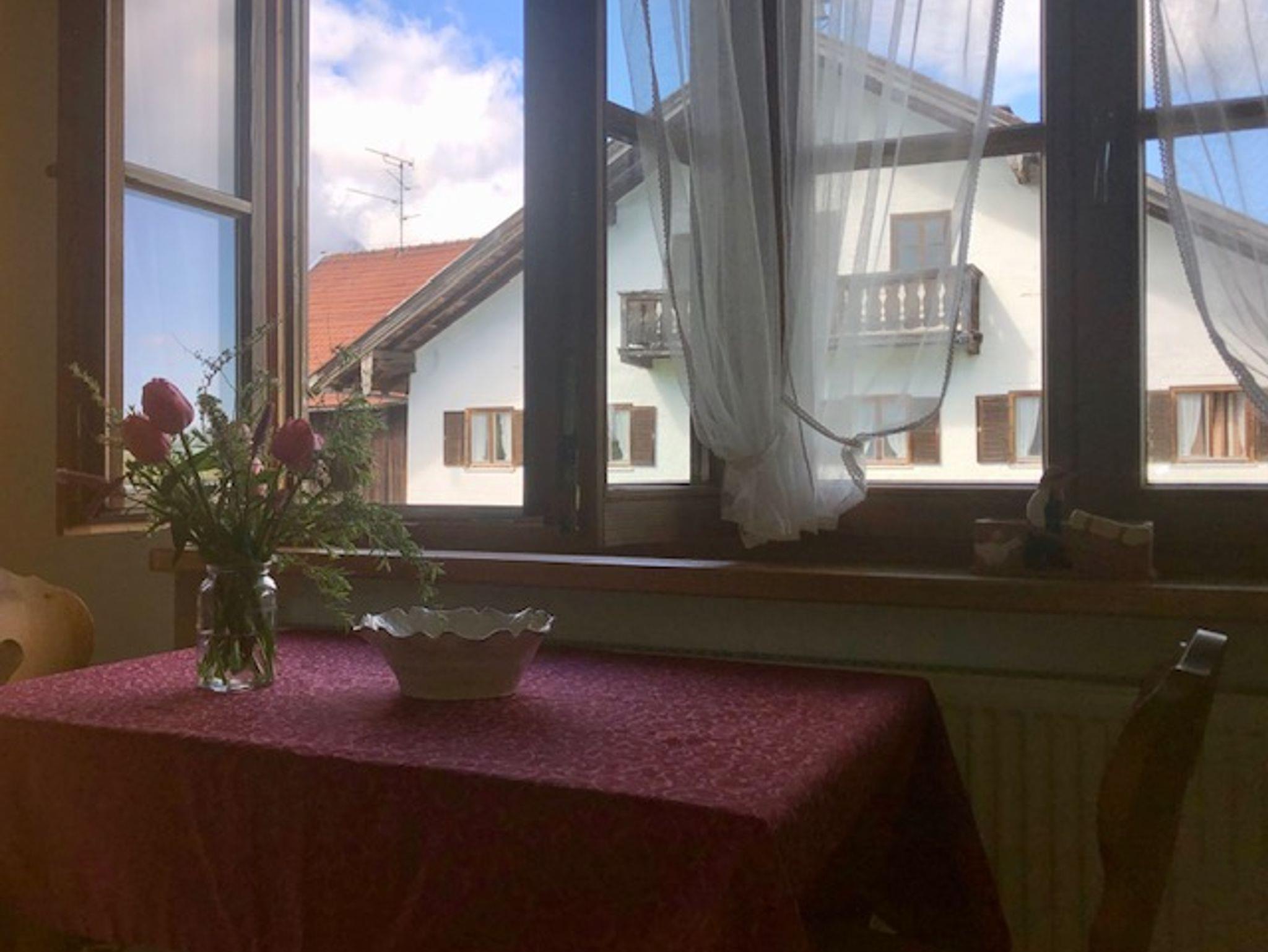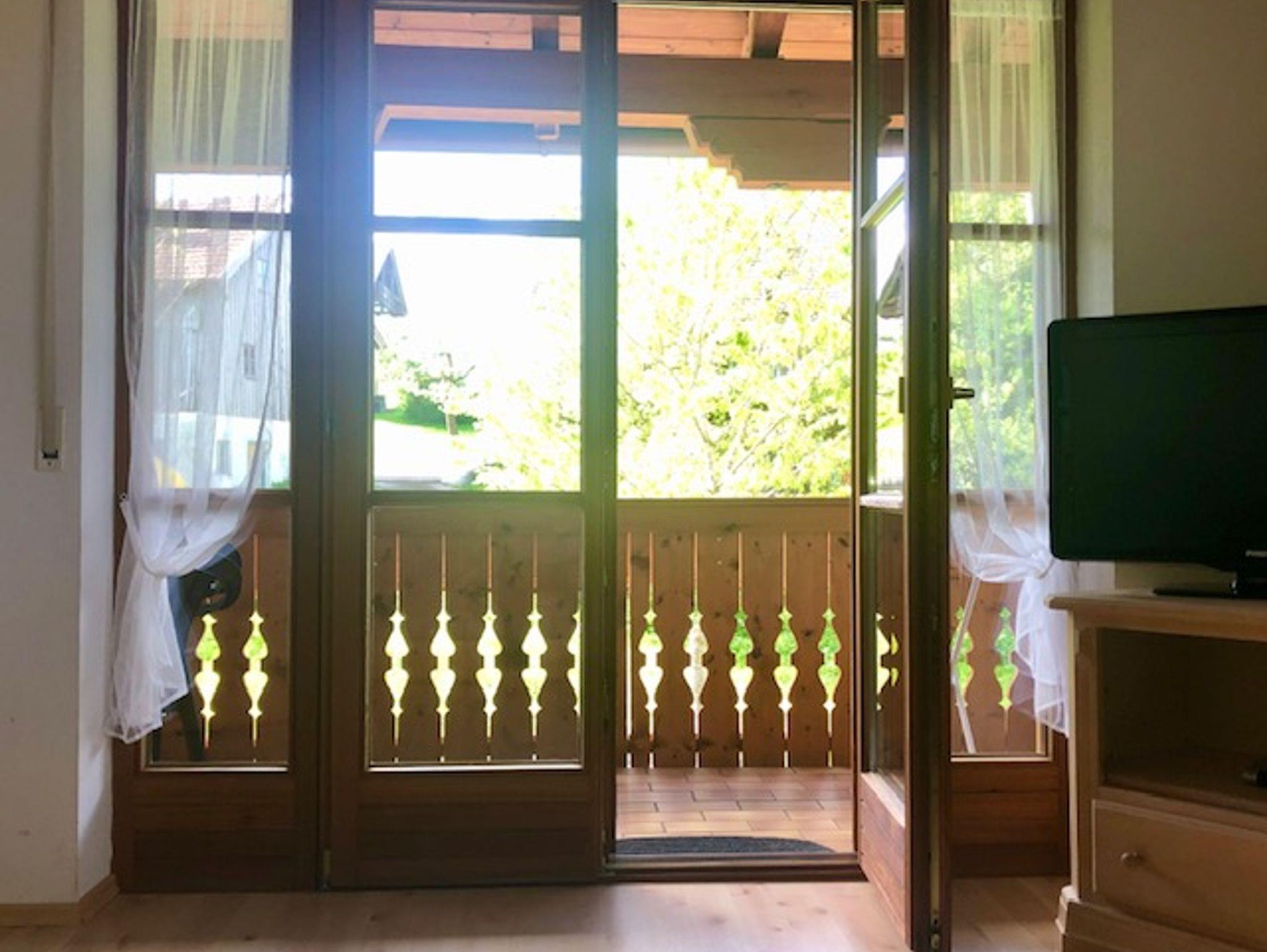 Die gemütlich eingerichtete Ferienwohnung 59 m² für 1 bis 6 Personen im Obergeschoss, besteht aus einer komplett ausgestatteter Küche mit Backofen, Geschirrspüler, Kühlschrank, Mikrowelle, 2 Schlafzimmer mit Doppelbett, Bad/ Dusche/WC, TV, Münzwaschmaschine im Keller, Herrlicher Blick vom Balkon auf die schönen Wiesen und das Voralpenland. Hunde willkommen.