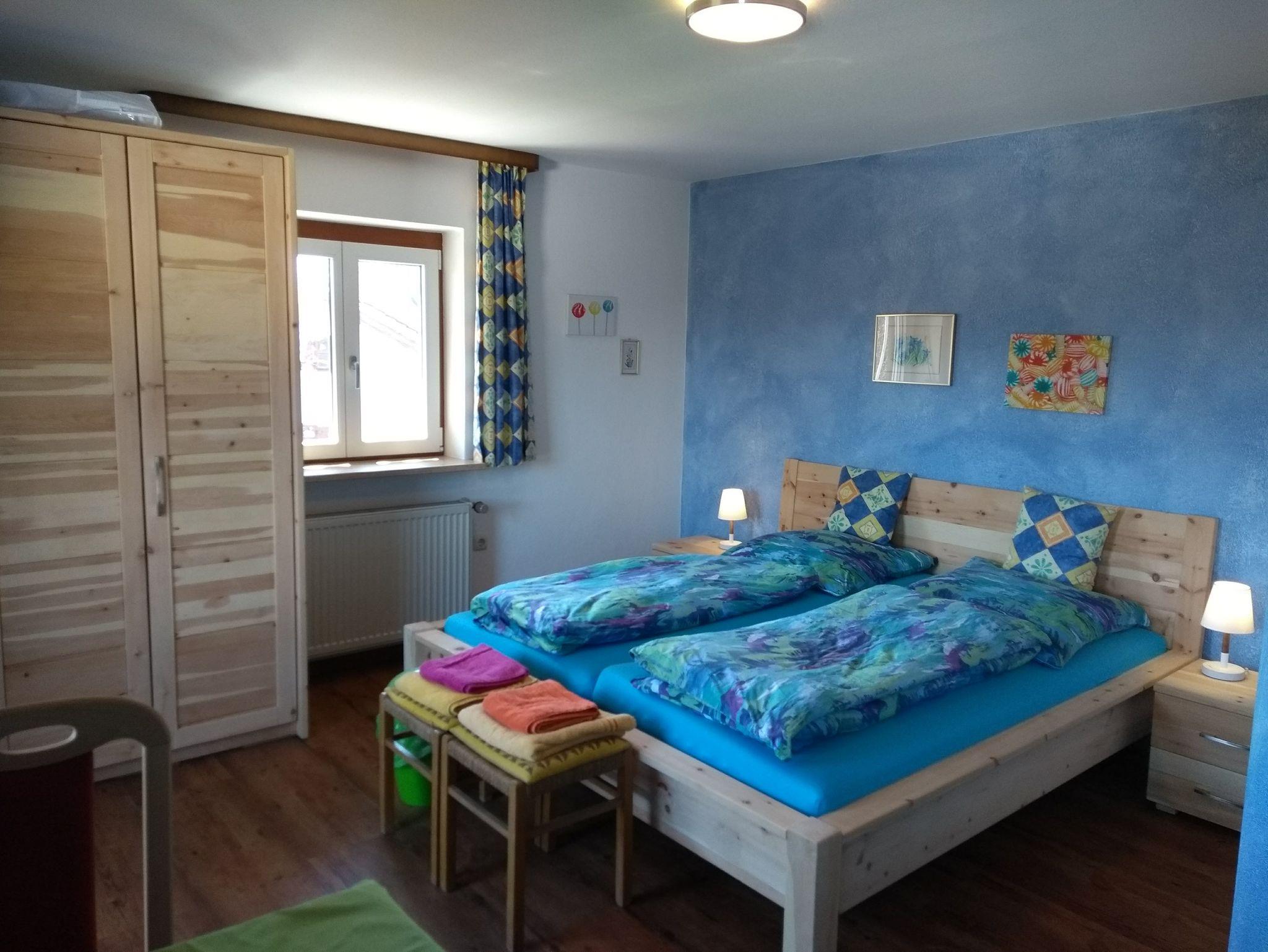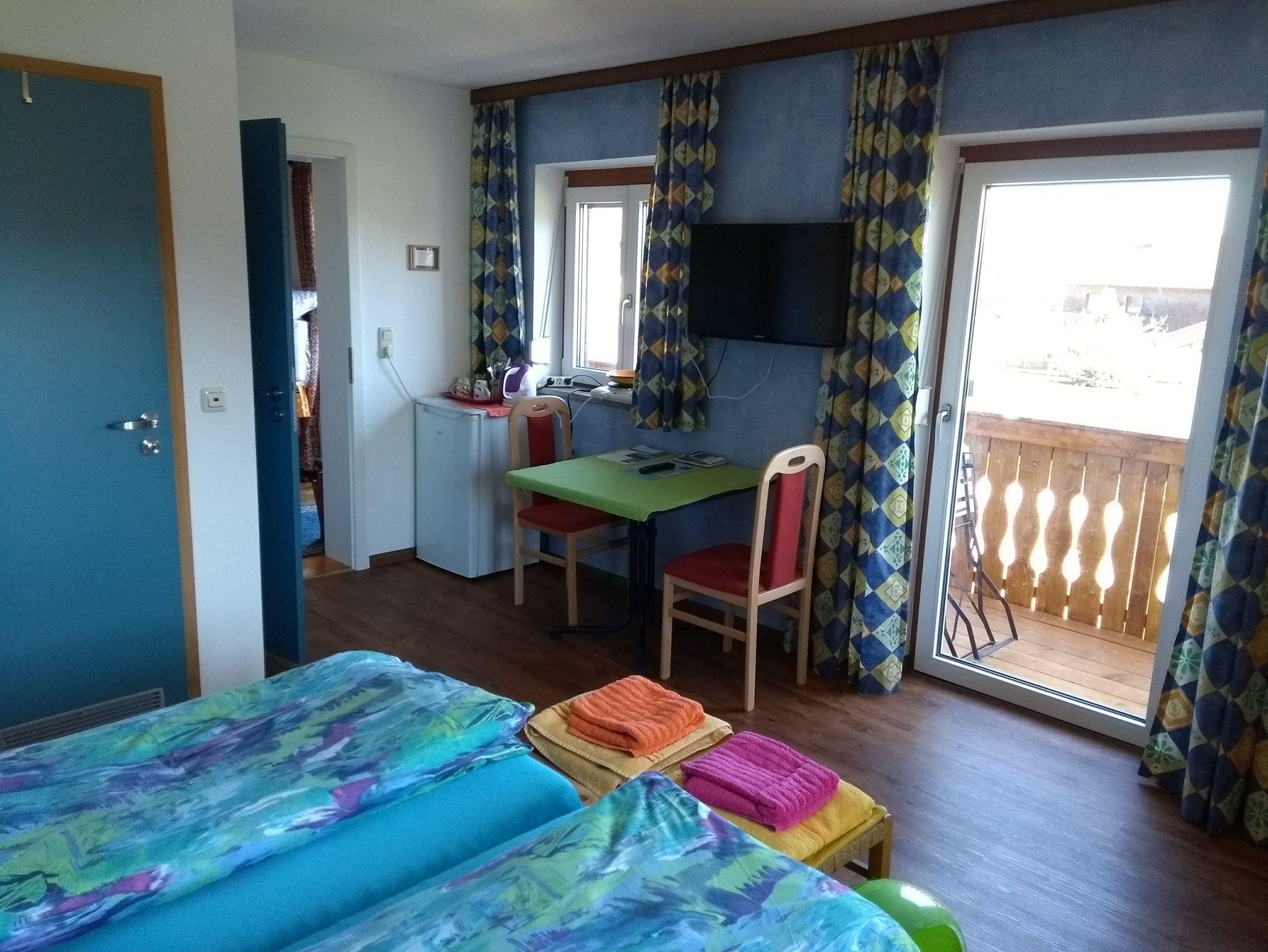 Letzte Teilrenovierung 2023, Flasche Wasser gratis. Gemütlich eingerichtete Zimmer im Landhausstil, mit separater Sitzmöglichkeit + Tisch, inkl. Dusche/WC, Kühlschrank als Minibar, Mikrowelle, Kochplatte, Wasserkocher, Flachbild-TV (32) im Zimmer (Kabel) und kostenlosem Internet (WLAN). Direkter Balkonzugang. Auf Wunsch mit zustellbaren Klapp- oder Kinderbett. Ein Balkonzimmer ist komplett mit Zirbenholz ausgestattet Doppelbett und Schrank, das andere mit 2 Einzelbetten zusammenschieb- oder trennbar. Auch gut geeignet für Monteure und Arbeiter. Max. 2 Haustiere erlaubt.