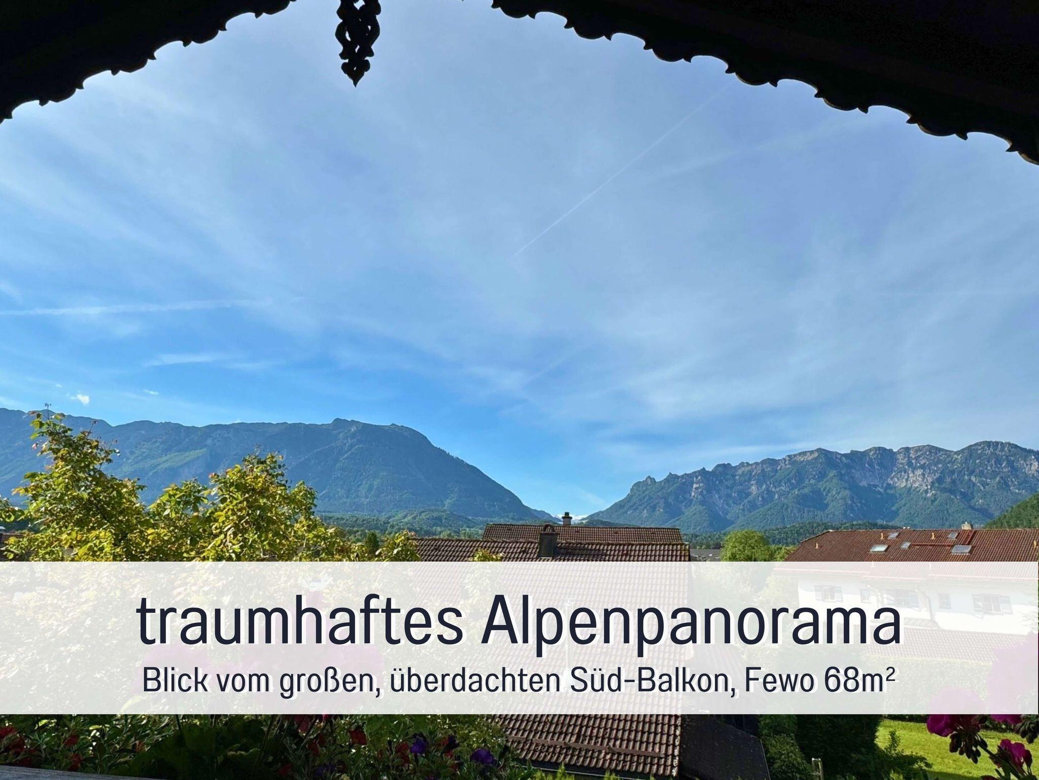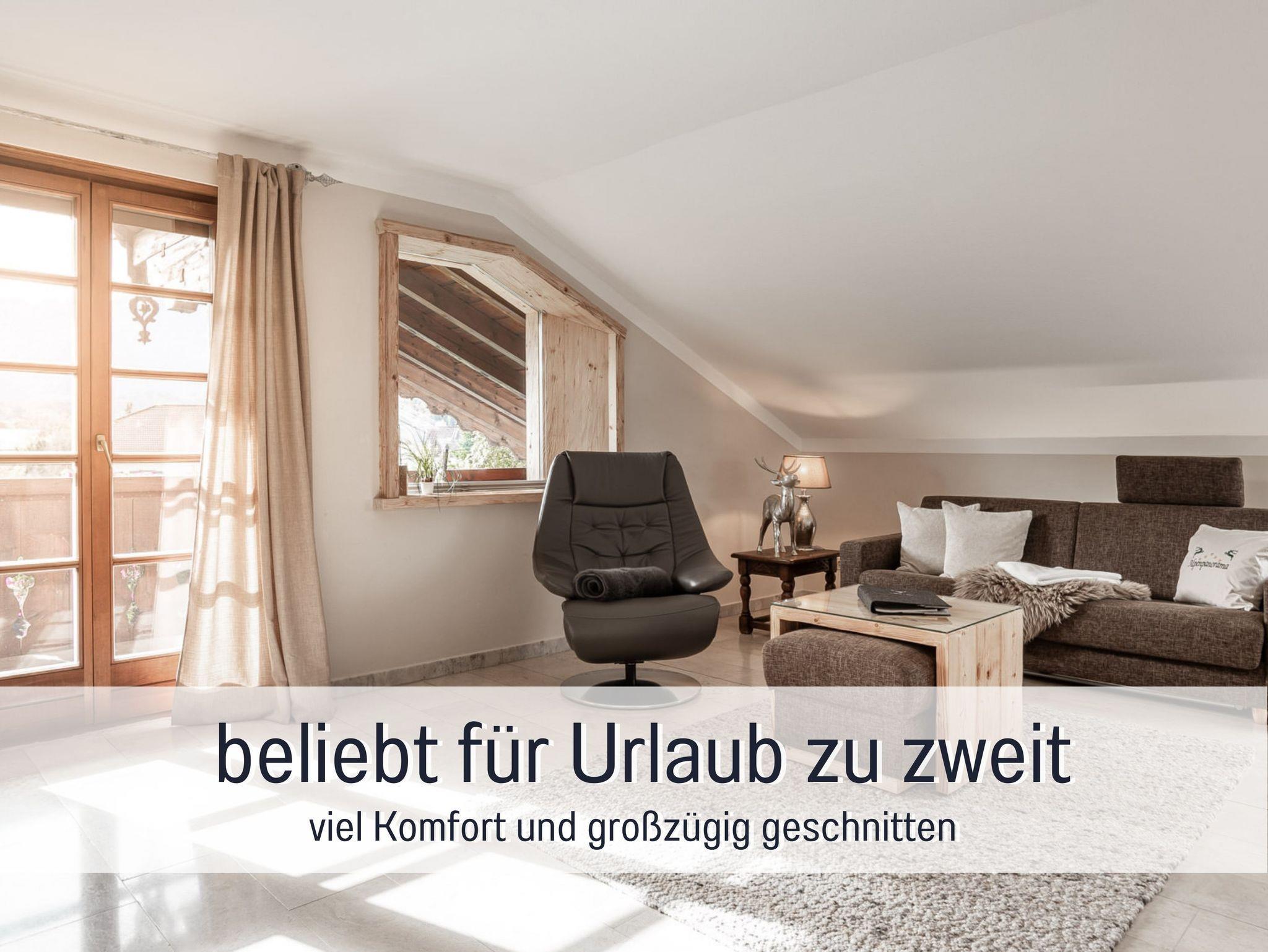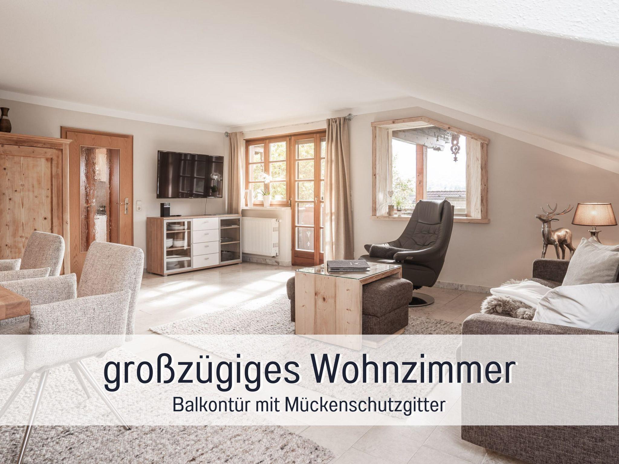 Große 5 Sterne-Ferienwohnung Alpenpanorama mit exklusiver Ausstattung (68 m²) für 2 Personen und herrlichem Blick auf Untersberg, Lattengebirge und Predigtstuhl sowie Schlafzimmer, Küche, Wohnzimmer, Dusche/WC und Balkon.