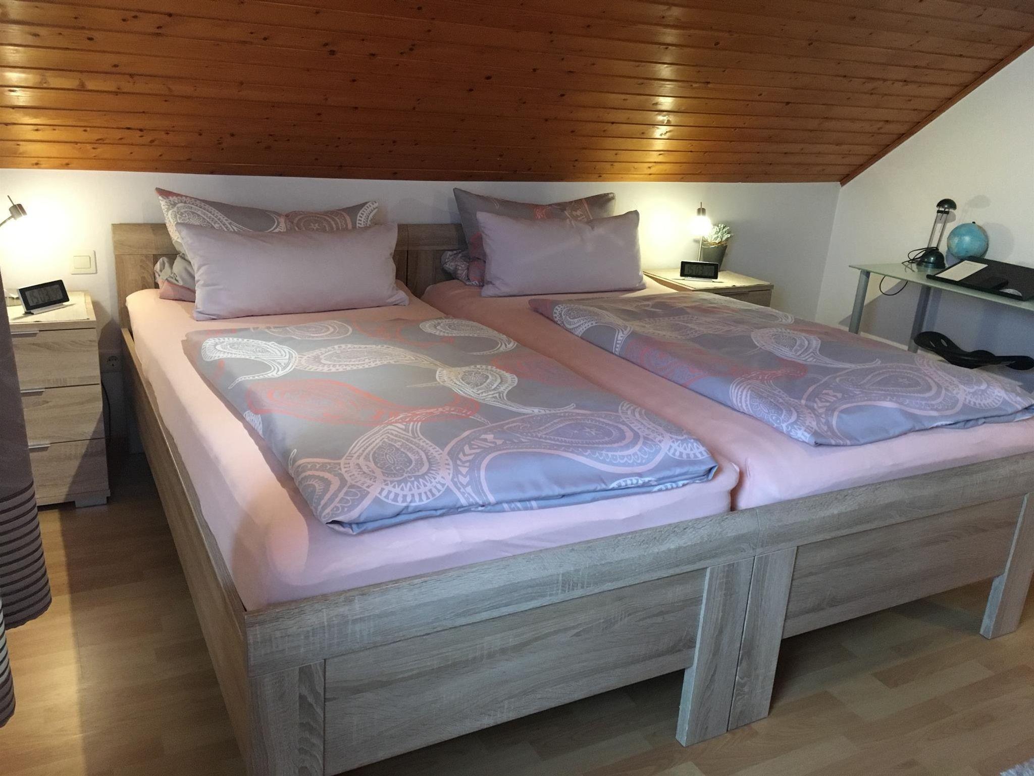 2 Betten (100x200 cm) in seniorengerechter Komforthöhe, abschließbarer Safe im Kleiderschrank, Schreibtisch, Fenster mit Rollladen verdunkelbar.