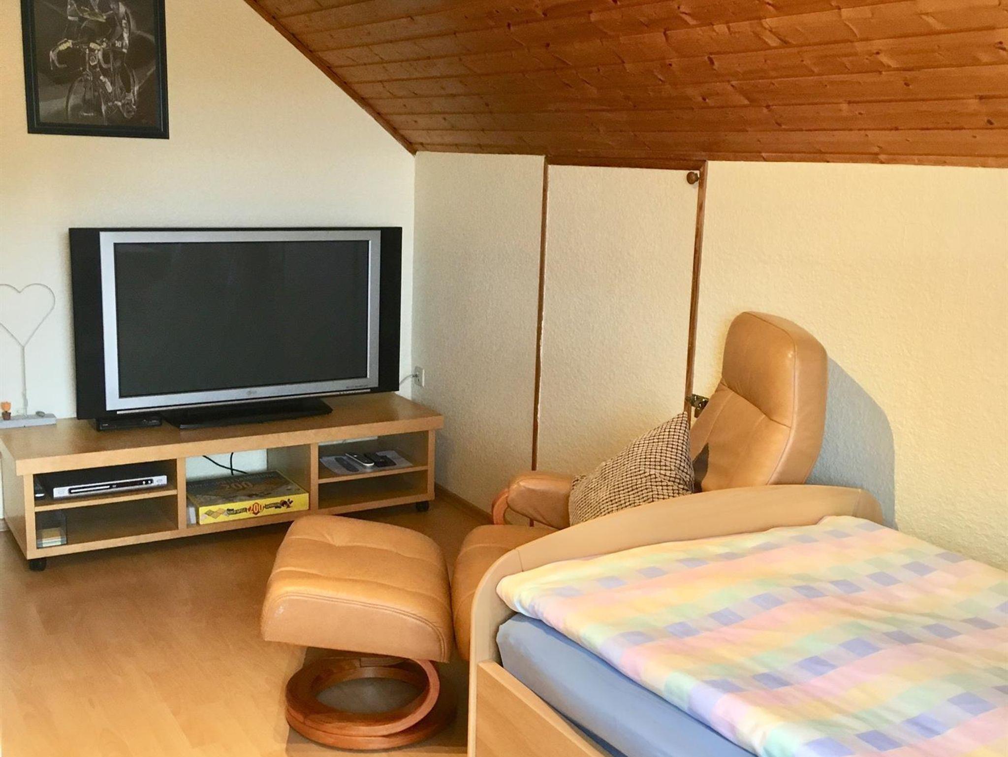 2 gemütliche Ledersofas, Tisch, großer 48 Zoll LED-TV, SAT-TV in HD- Qualität, das Gesamtpaket Magenta Sport der Telekom, kleine Stereoanlage, zusätzliches Schlafsofa (180X200cm), verschiedene Bücher und Brettspiele, Infomaterial zu touristischen Ausflugszielen, Prospekte und Bücher der Ferienregion, Fenster mit Rollladen verdunkelbar.