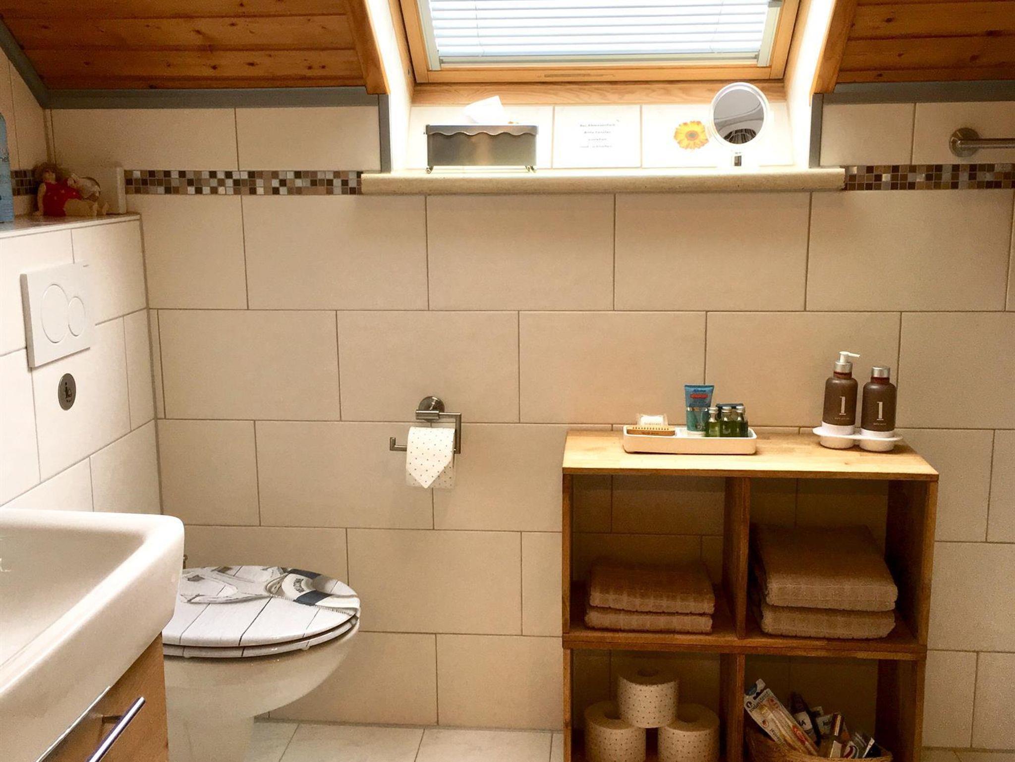 Glasdusche, WC, Abstellmöglichkeiten, Föhn und Notfallbox mit verschiedenen Hygieneartikeln.