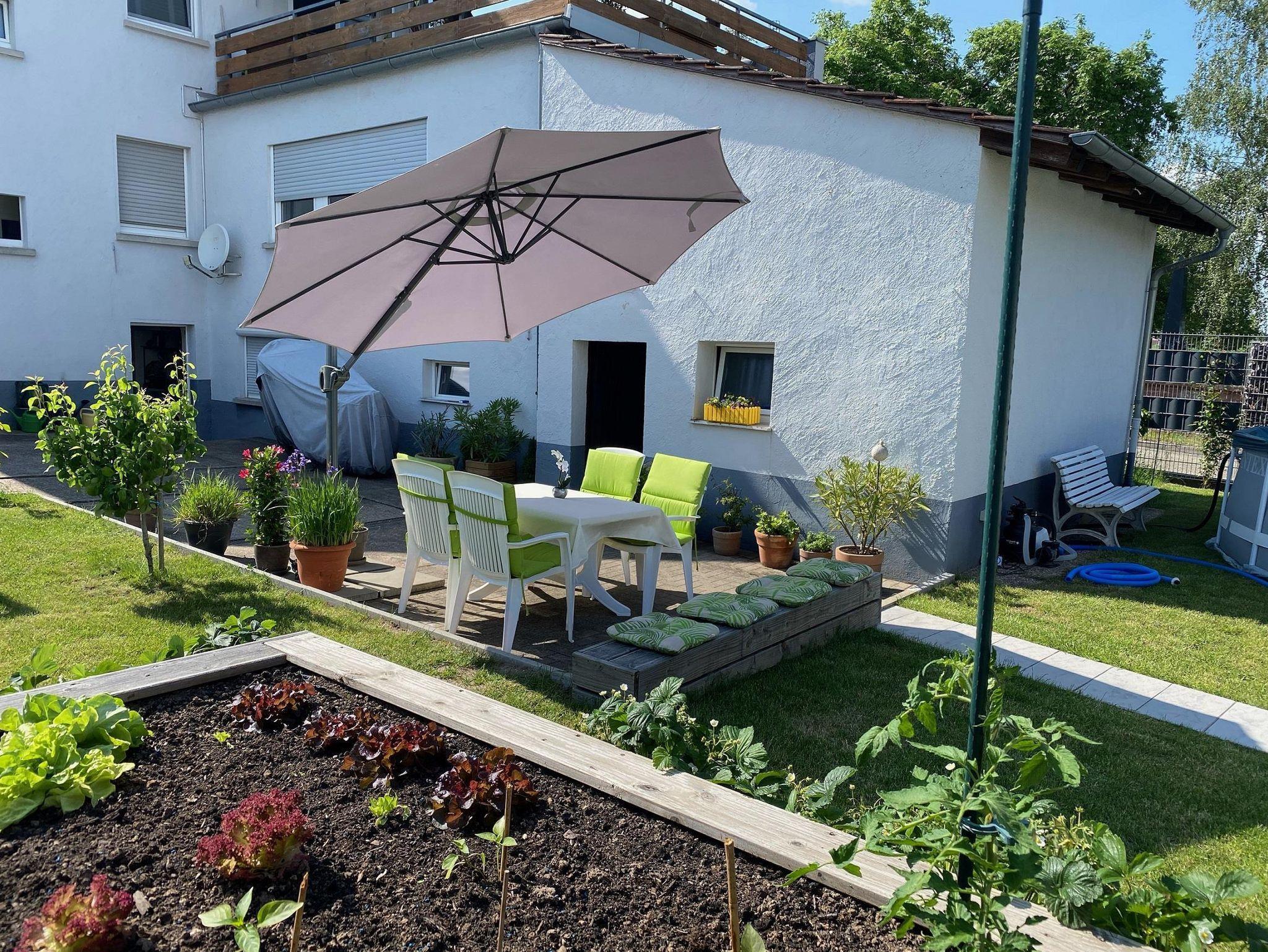 gemütliche Sitzecke im Grünen (Südseite) mit Sonnenschirm, Sitzauflagen und Tischdecke