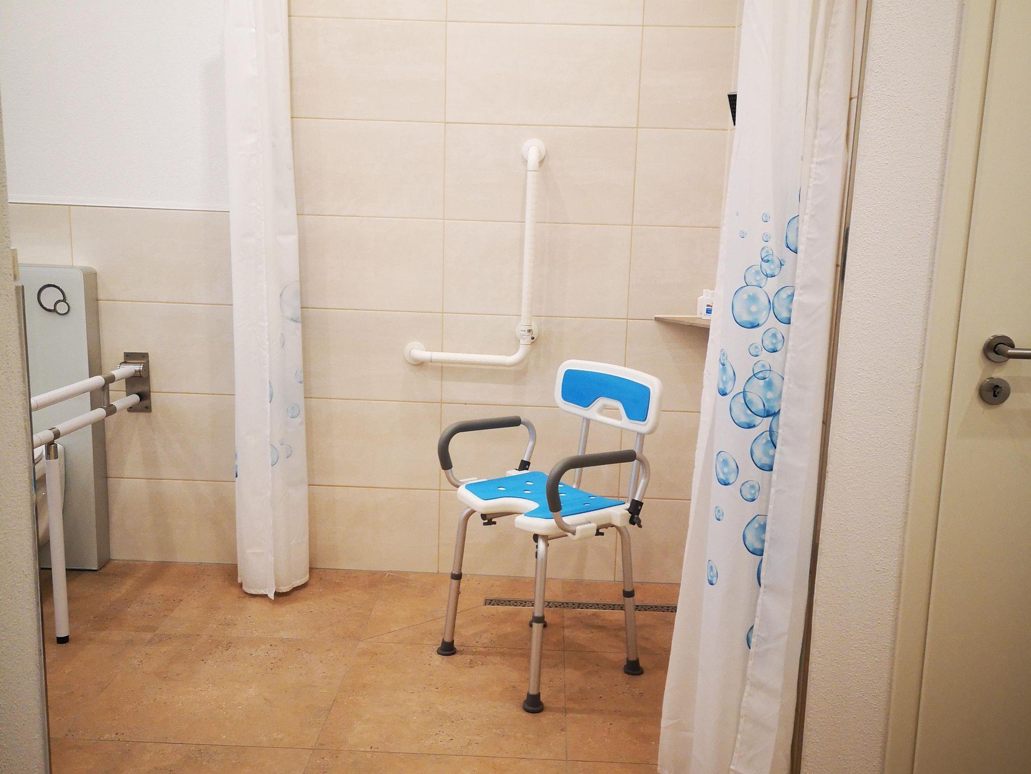 Nichtraucherwohnung 62 m², rollstuhlgerecht. Ausstattung: 1 Schlafzimmer mit Boxspringbett, Liegefläche 2,00 x 1,80 m. 1 Tageslichtbad mit rollstuhlbefahrbarer Dusche, Duschstuhl, Behinderten WC mit klappbaren Armstützen, Waschbecken unterfahrbar, Waschmaschine, Trockner, Föhn, großer Spiegel. Handtücher ausreichend vorhanden. 2 kleine Abstellräume, 1 großer Wohn-, Ess-, Kochbereich mit Schlafcouch, Sat-TV, Musikanlage, WLAN, unterfahrbarer Esstisch, rollstuhlgerechte, gut ausgestattete Küche, Herd und Spüle unterfahrbar, Dunstabzugshaube mit Fernbedienung, Ceran-Kochfeld, Geschirrspülmaschine, Backofen, Kühlschrank, kombinierte Mikrowelle, Wasserkocher, Senseo-Kaffeemaschine, Toaster. Geschirrtücher vorhanden. Sitzgruppe im Außenbereich. Parkplätze vor Ort. Keine Haustiere.