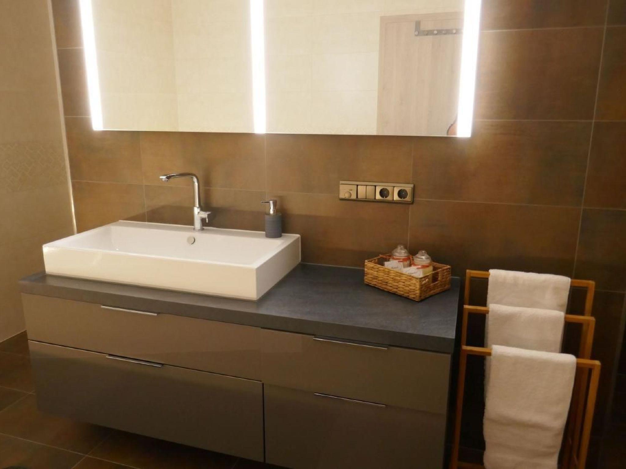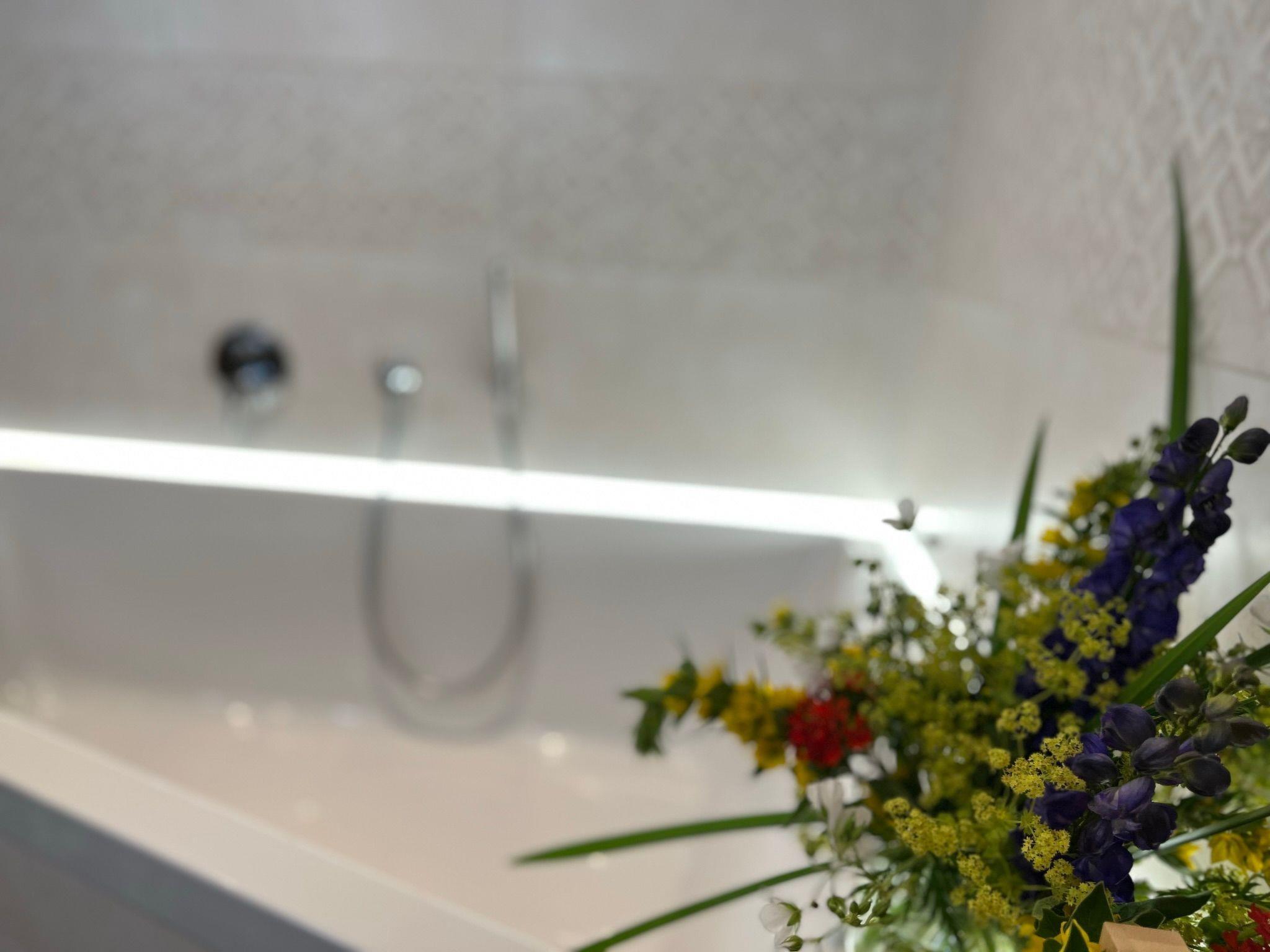 The holiday suite extends over approx. 120 square metres on the ground floor and has three inviting bedrooms, a living room with an open-plan kitchen and dining area as well as a hallway and a guest WC. The wellness bathroom promises special relaxation with its infrared deep-heat sauna, which provides additional well-being with a brine nebuliser, and a large bathtub for two people. A cot can also be accommodated on request. The facilities leave nothing to be desired and guarantee a comfortable stay.