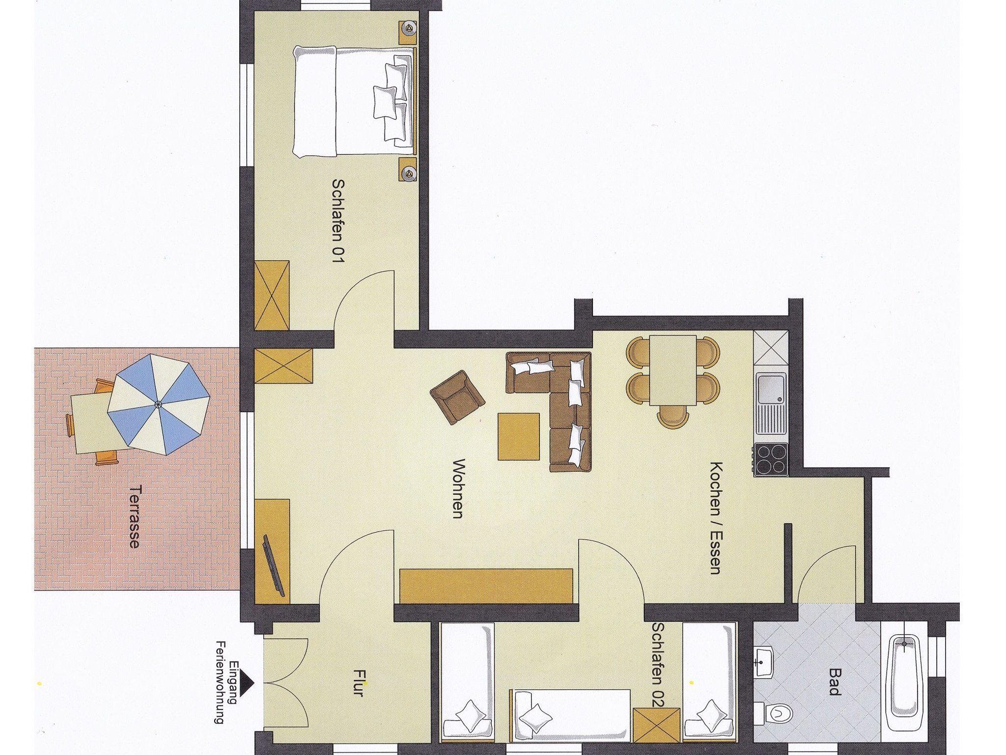 Die Ferienwohnung verfügt über 2 separate Schlafräume, 1 Wohnraum mit Couch und TV, 1 Badezimmer und Badewanne/WC, Küche mit Geschirrspüler,