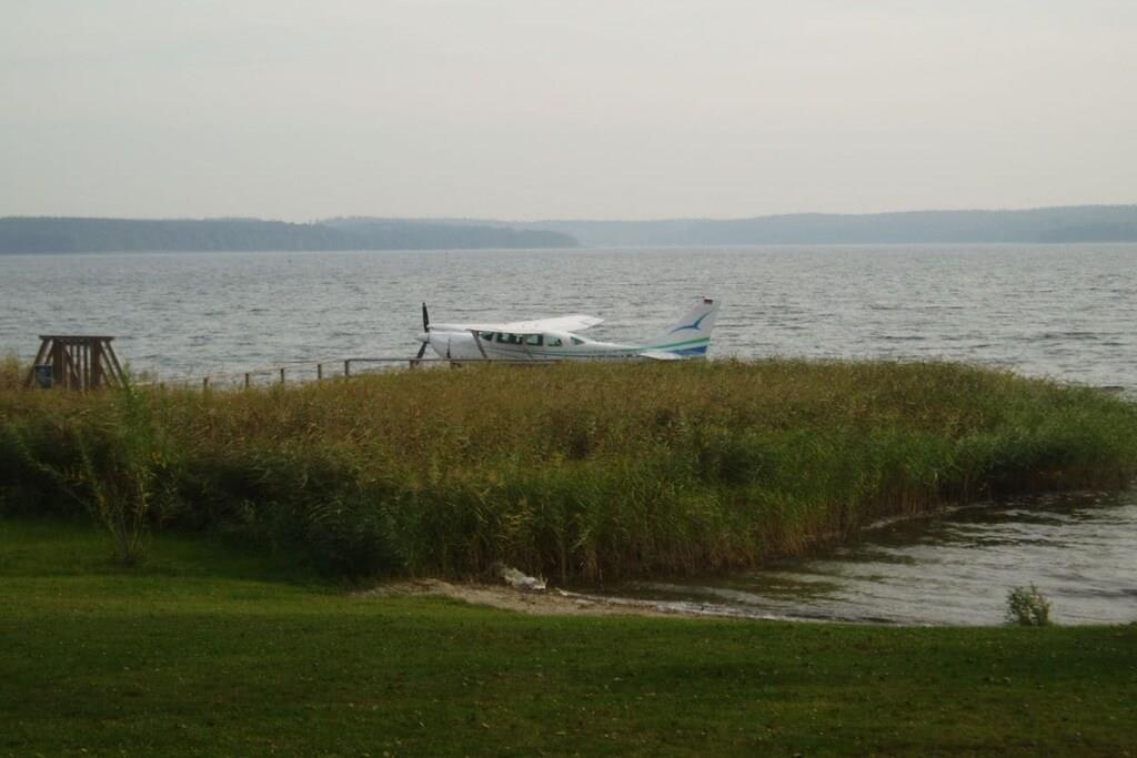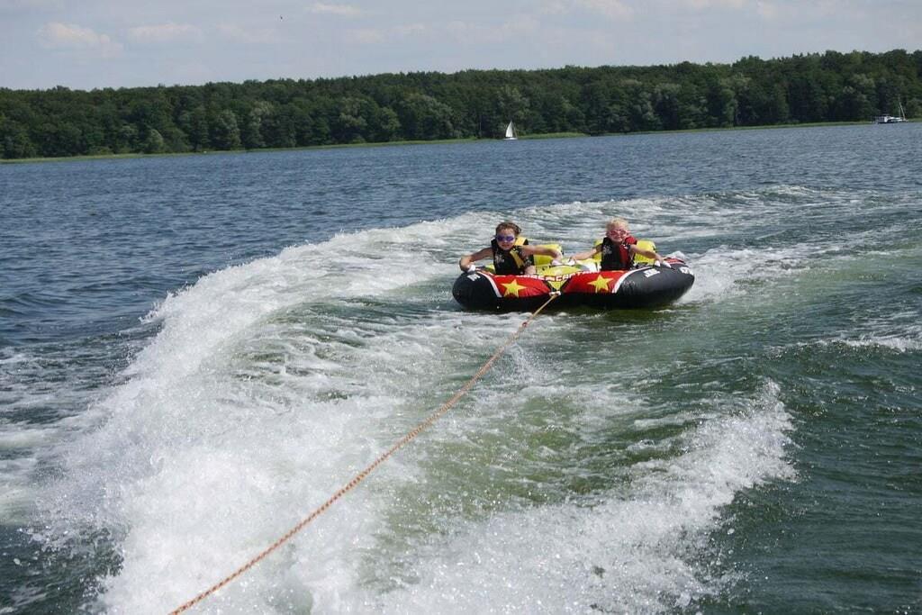 Spend your holiday in this relaxing holiday home in a fantastically beautiful location directly on Lake Plauer, quietly located and not far from the idyllic listed old town! The holiday home is located on a 500 sqm natural plot. There is a second holiday home on the adjacent property and can also be booked on request if desired. The furnishings in a Mediterranean ambience are cozy and comfortable over 2 floors with a spiral staircase and are only 50 meters from the beach with a playground. The exclusive holiday home has 100 m² of living space for 6 people. On the ground floor there is an open living and dining area with a fireplace, a fully equipped kitchen with a counter (stove with ceramic hob, oven, refrigerator with freezer compartment, dishwasher, microwave, coffee machine, kettle, toaster, sufficient dishes), 1 bedroom with a double bed, 1 shower room with sauna and a hallway with a cloakroom. On the upper floor there are 2 further bedrooms and an additional bathroom with a bathtub and washing machine. From the balcony or the terrace with awning you can enjoy the unique view of the lake in peace and quiet, have a relaxed breakfast or barbecue. Barbecues and loungers are available in the lockable outbuilding. Bicycles can also be parked here. There are also parking spaces for 2 cars and a trailer parking space.