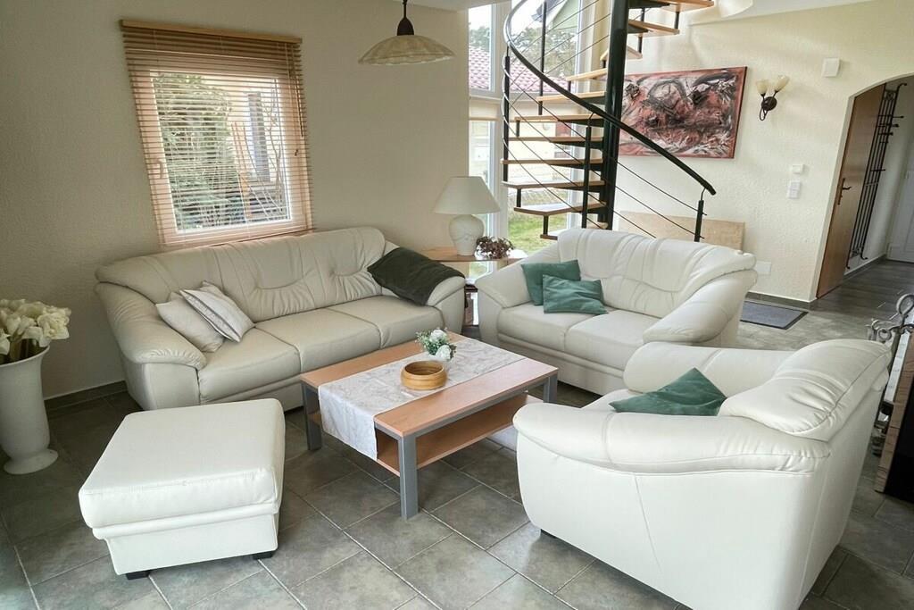 Spend your holiday in this relaxing holiday home in a fantastically beautiful location directly on Lake Plauer, quietly located and not far from the idyllic listed old town! The holiday home is located on a 500 sqm natural plot. There is a second holiday home on the adjacent property and can also be booked on request if desired. The furnishings in a Mediterranean ambience are cozy and comfortable over 2 floors with a spiral staircase and are only 50 meters from the beach with a playground. The exclusive holiday home has 100 m² of living space for 6 people. On the ground floor there is an open living and dining area with a fireplace, a fully equipped kitchen with a counter (stove with ceramic hob, oven, refrigerator with freezer compartment, dishwasher, microwave, coffee machine, kettle, toaster, sufficient dishes), 1 bedroom with a double bed, 1 shower room with sauna and a hallway with a cloakroom. On the upper floor there are 2 further bedrooms and an additional bathroom with a bathtub and washing machine. From the balcony or the terrace with awning you can enjoy the unique view of the lake in peace and quiet, have a relaxed breakfast or barbecue. Barbecues and loungers are available in the lockable outbuilding. Bicycles can also be parked here. There are also parking spaces for 2 cars and a trailer parking space.