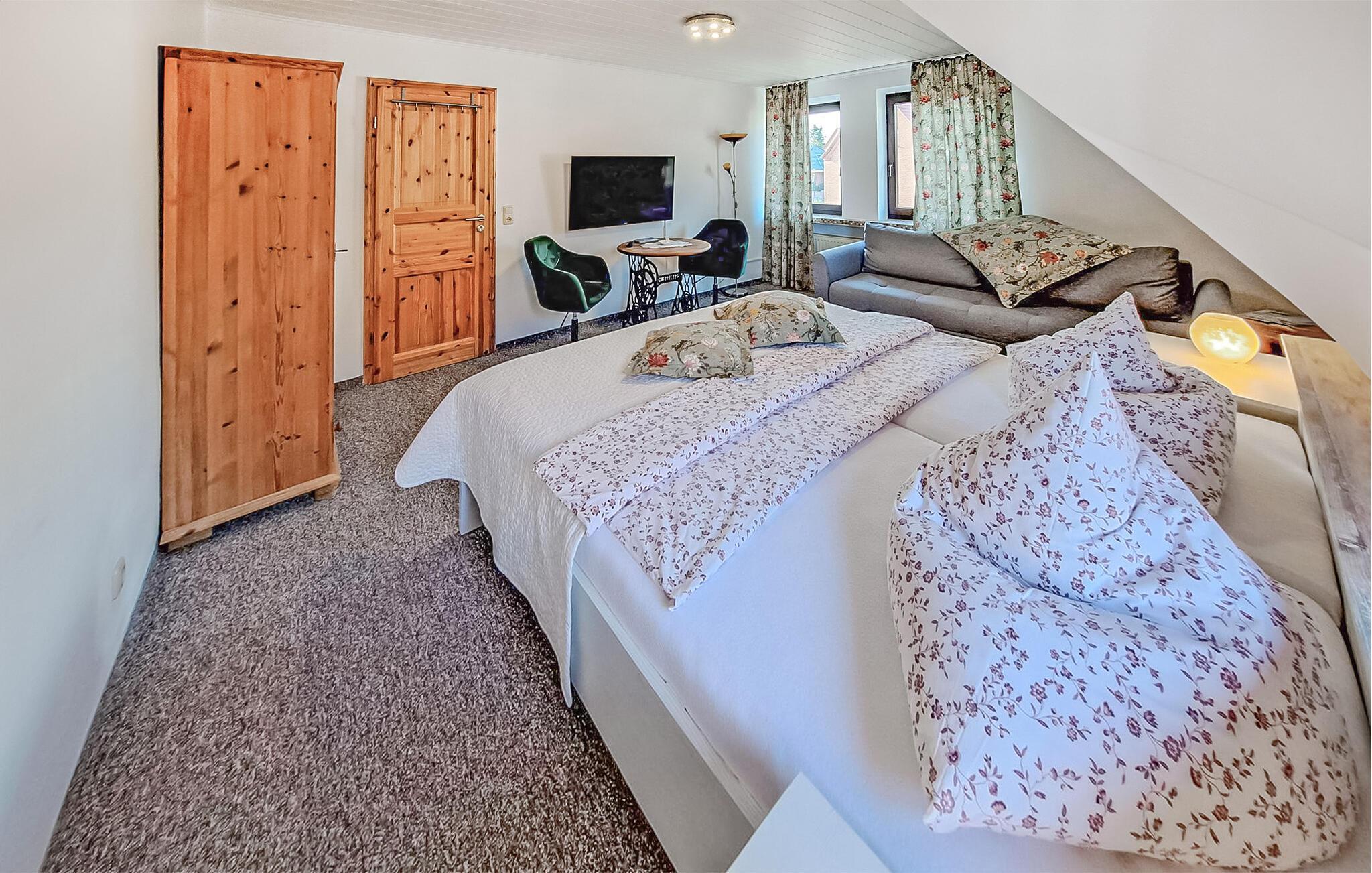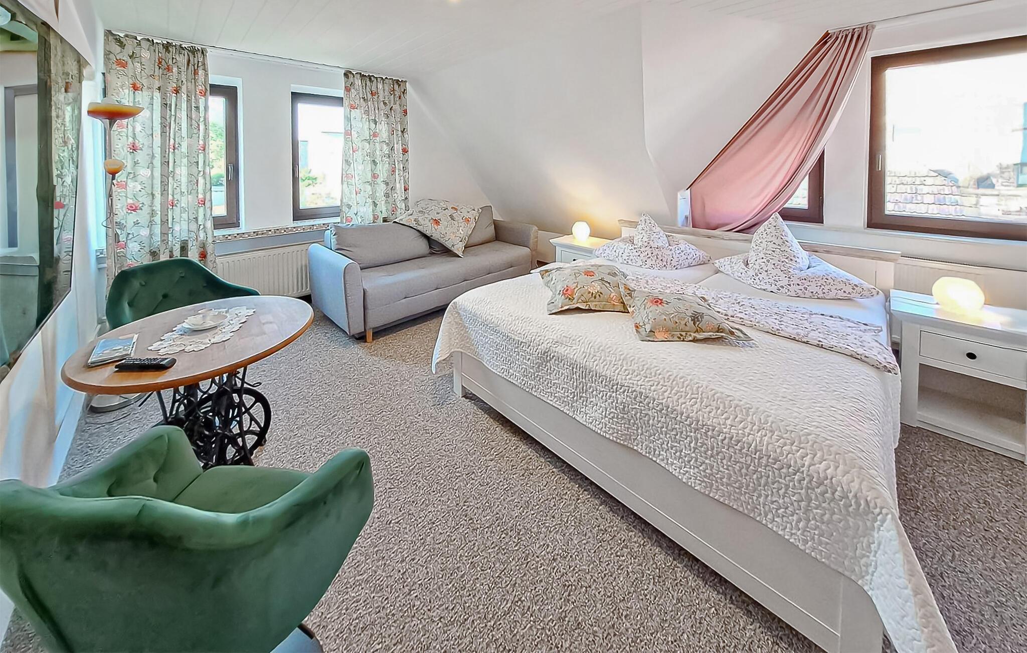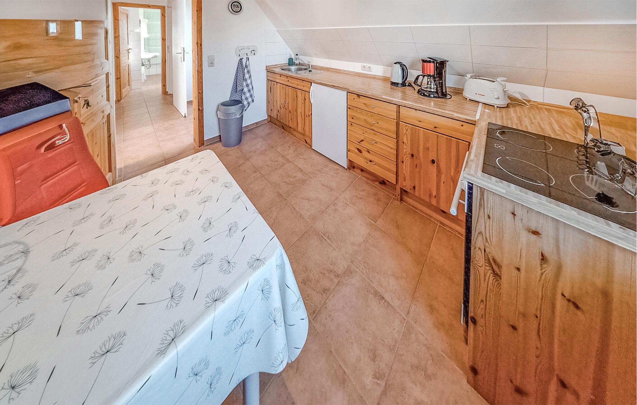 Diese Wohnung befindet sich im Obergeschoss. Sie ist ausgestattet mit einem kombinierten Wohn-/Schlafraum mit Doppelbett, Schlafsofa, TV und Radio, einer Küche mit Elektroherd, Kühlschrank, diversen Küchenkleingeräten und einer Essecke sowie einem Bad mit Dusche und WC. Die Wohnung ist mit einer Zentralheizung ausgestattet. Die Zimmer sind über einen gemeinsamen Flur zu erreichen. Haustiere: Haustiere sind in dieser Wohnung nicht erlaubt.