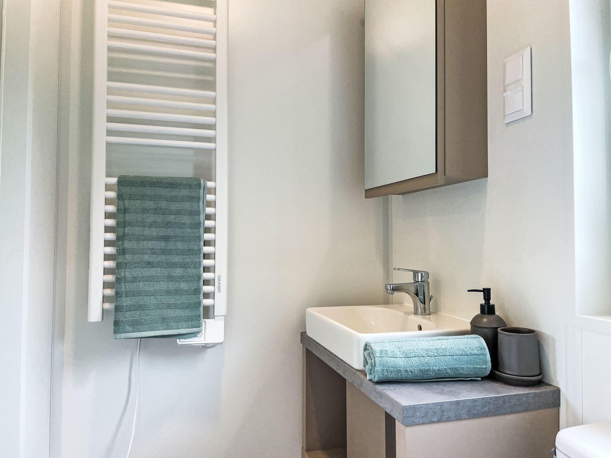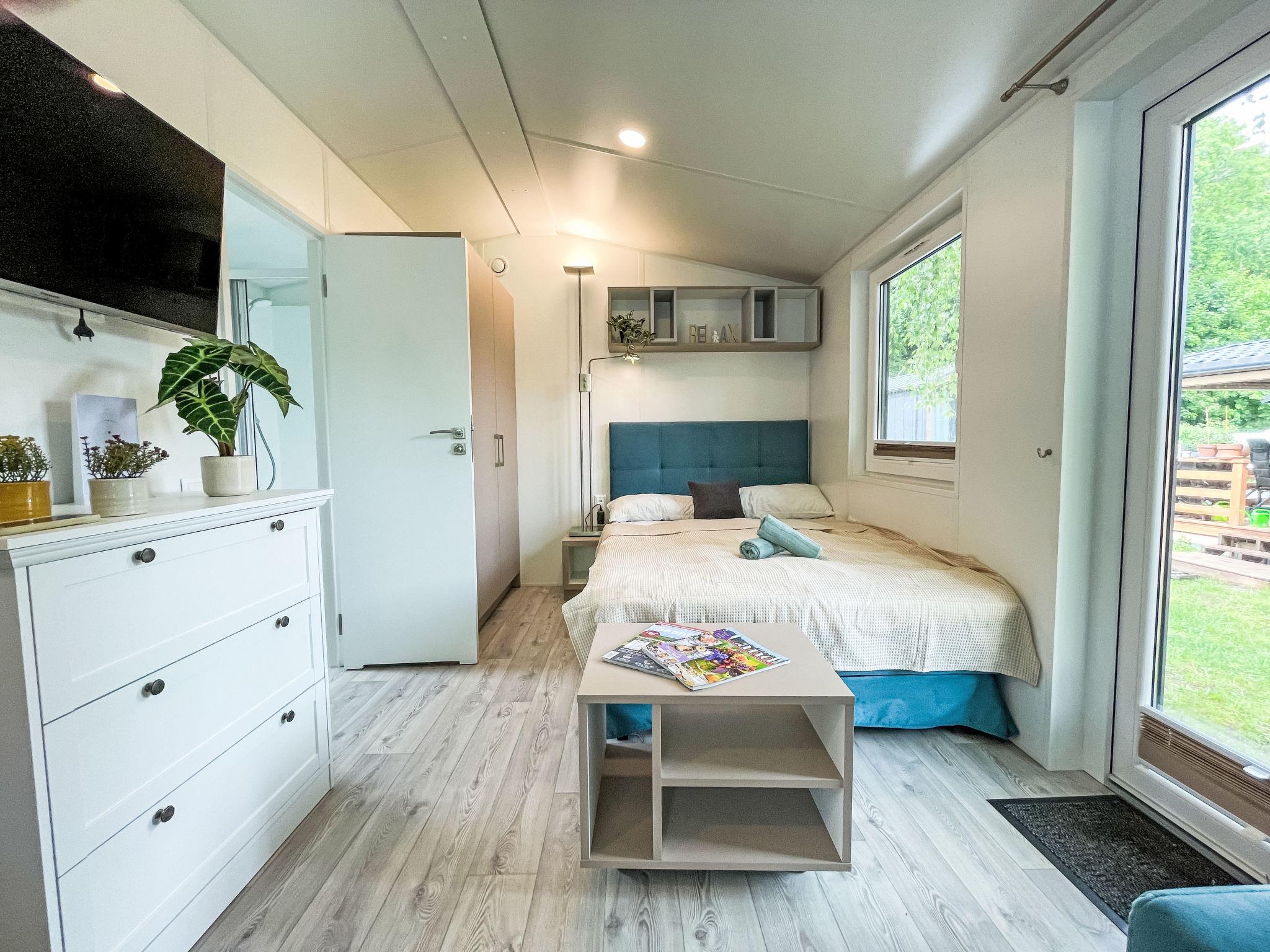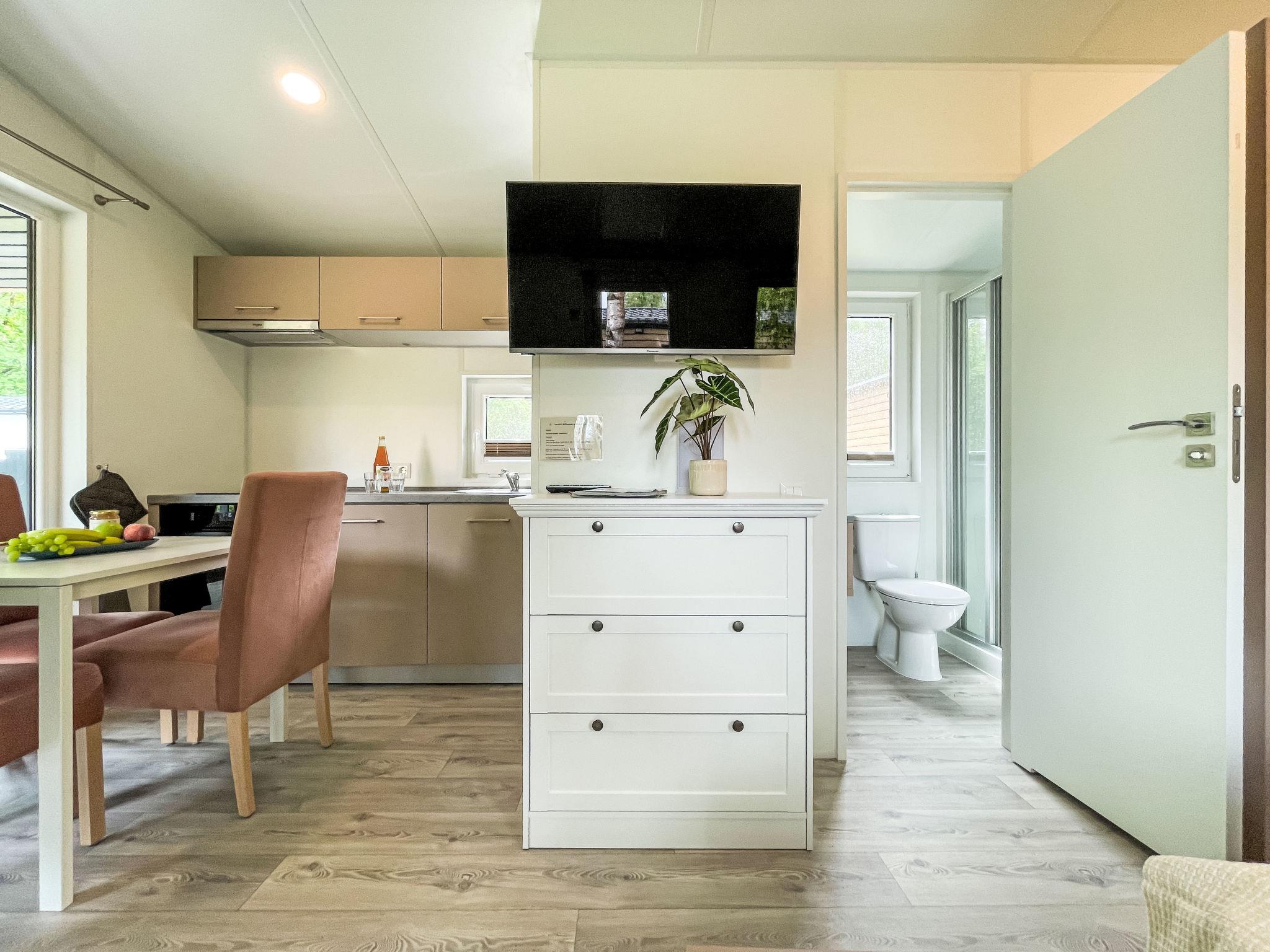 1-room mobile home 30 m2. Modern and cosy furnishings: living/sleeping room with 1 double bed (160 cm, length 200 cm), satellite TV and digital TV (flat screen). Exit to the terrace. Open kitchen (oven, 2 induction hot plates, kettle). Shower/WC. Electric heating. Terrace roofed. Terrace furniture. Beautiful view of the forest. Facilities: Internet (WiFi, extra). Parking at the house. Please note: non-smoking house. Maximum 1 pet/ dog allowed. Smoke alarm.