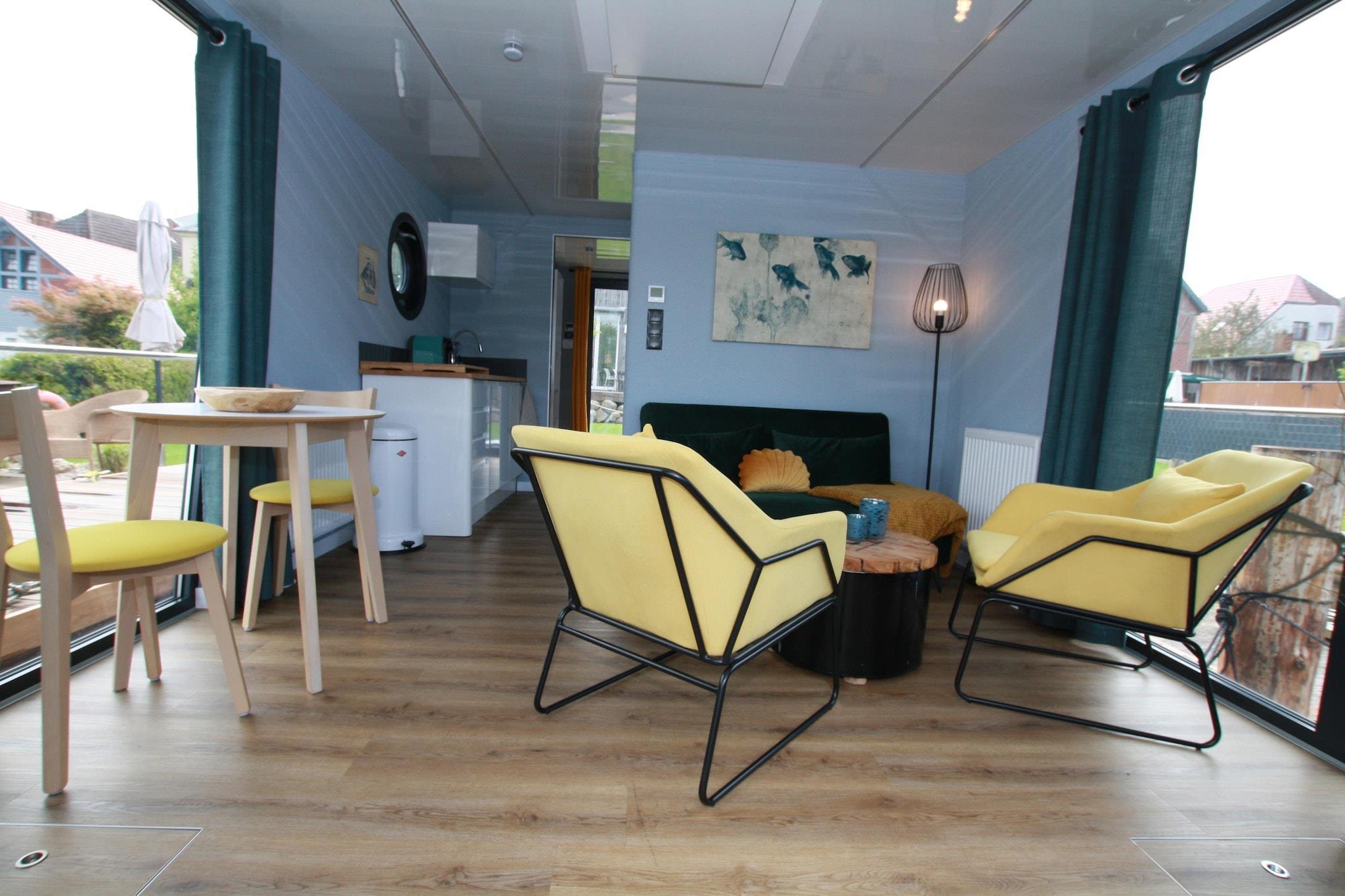 Ground floor: (open kitchen(hob(2 ring stoves, induction), electric kettle, toaster, coffee machine(pads), fridge(+ freezer)), Living/diningroom(TV(flatscreen), dining table, seating area, DVD player), bedroom(double bed(180 x 200 cm)), bathroom(shower, washbasin, toilet, hairdryer)) heating(electric, floor heating), roof terrace, garden furniture, sun loungers, Laundry Package incl., parking (paying)