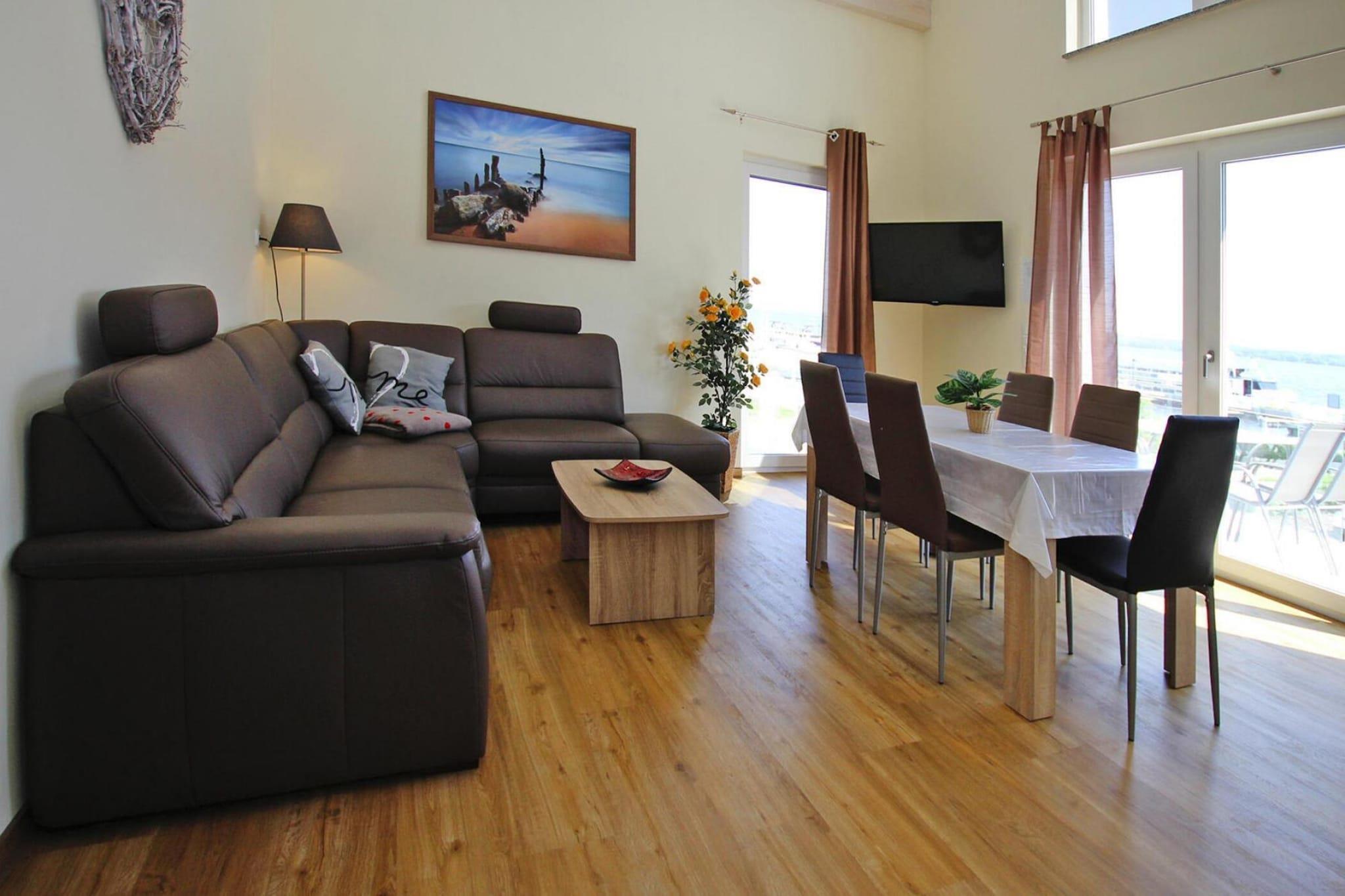 Completely newly built terraced house with high-quality furnished apartment directly at the marina of the former fishing town of Plau am See. A boat rental is right on the doorstep and from the balcony of your comfortable holiday home you can enjoy a wonderful view over the lake. The center and the old town of the charming town and climatic health resort of Plau am See can be reached on foot from here. Various restaurants and cafés serve Mecklenburg specialties and small shops invite you to browse. There are also sights worth seeing such as the Plau castle tower from 1449 with its deep dungeon and narrow climb, the famous lift bridge from 1916 and the town church from the 13th century, which can be seen from afar. Highlights included: All consumption-dependent energy costs Bed linen Wi-Fi Activities nearby: Go on a guided fishing trip or a cutter trip, take a trip on one of the passenger ships or discover the lake on a paddle tour - the possibilities are incredibly varied! Those who prefer to keep their feet dry can take a city tour on the small Plauer Bahn or discover the beauty of the landscape during a bike tour or a carriage ride. Sporty types can test their skills in the climbing park. Excursion tips: the Müritz Bear Forest, the Wangeliner Garden and the Lübzer Kunstspeicher.