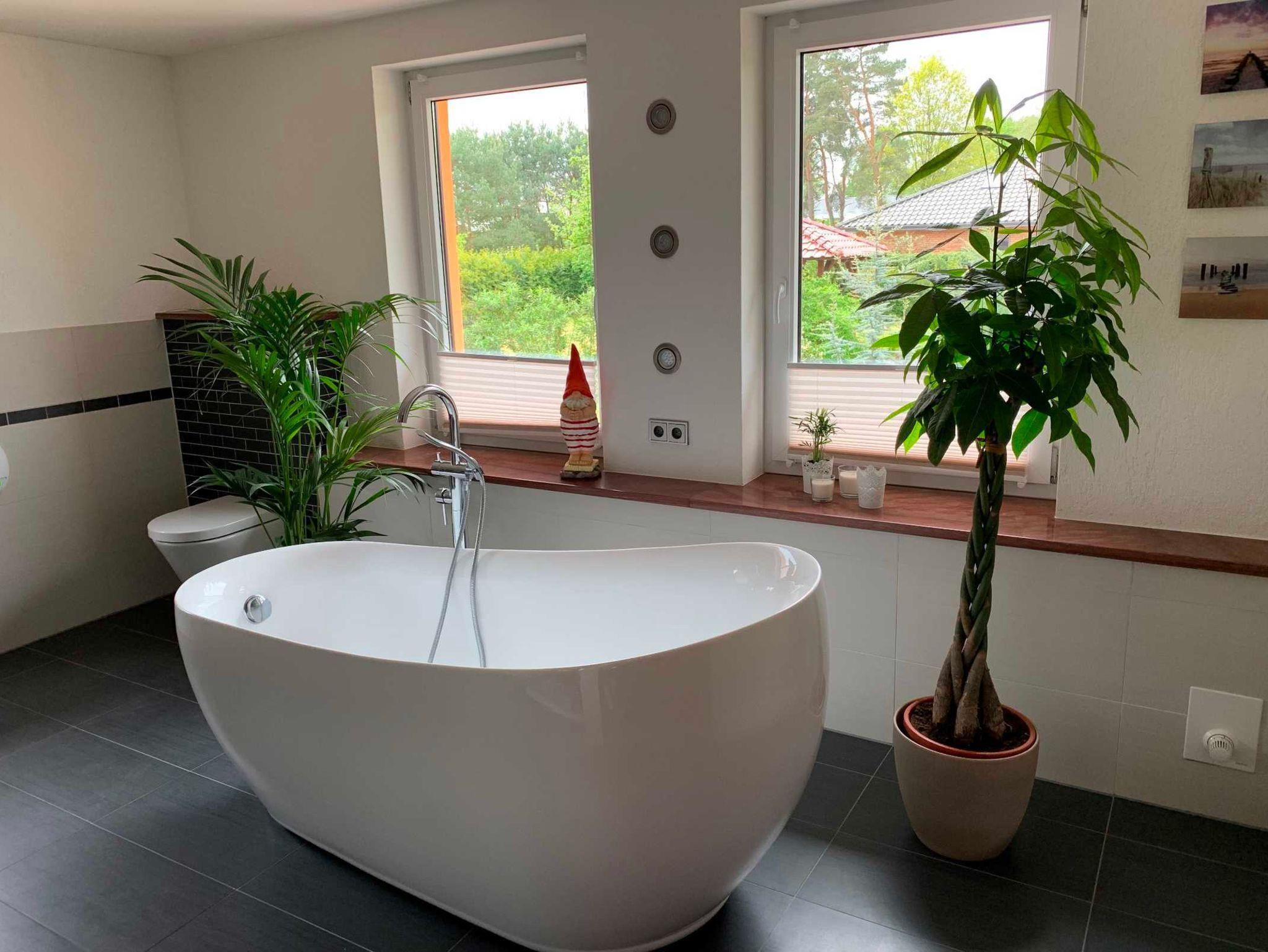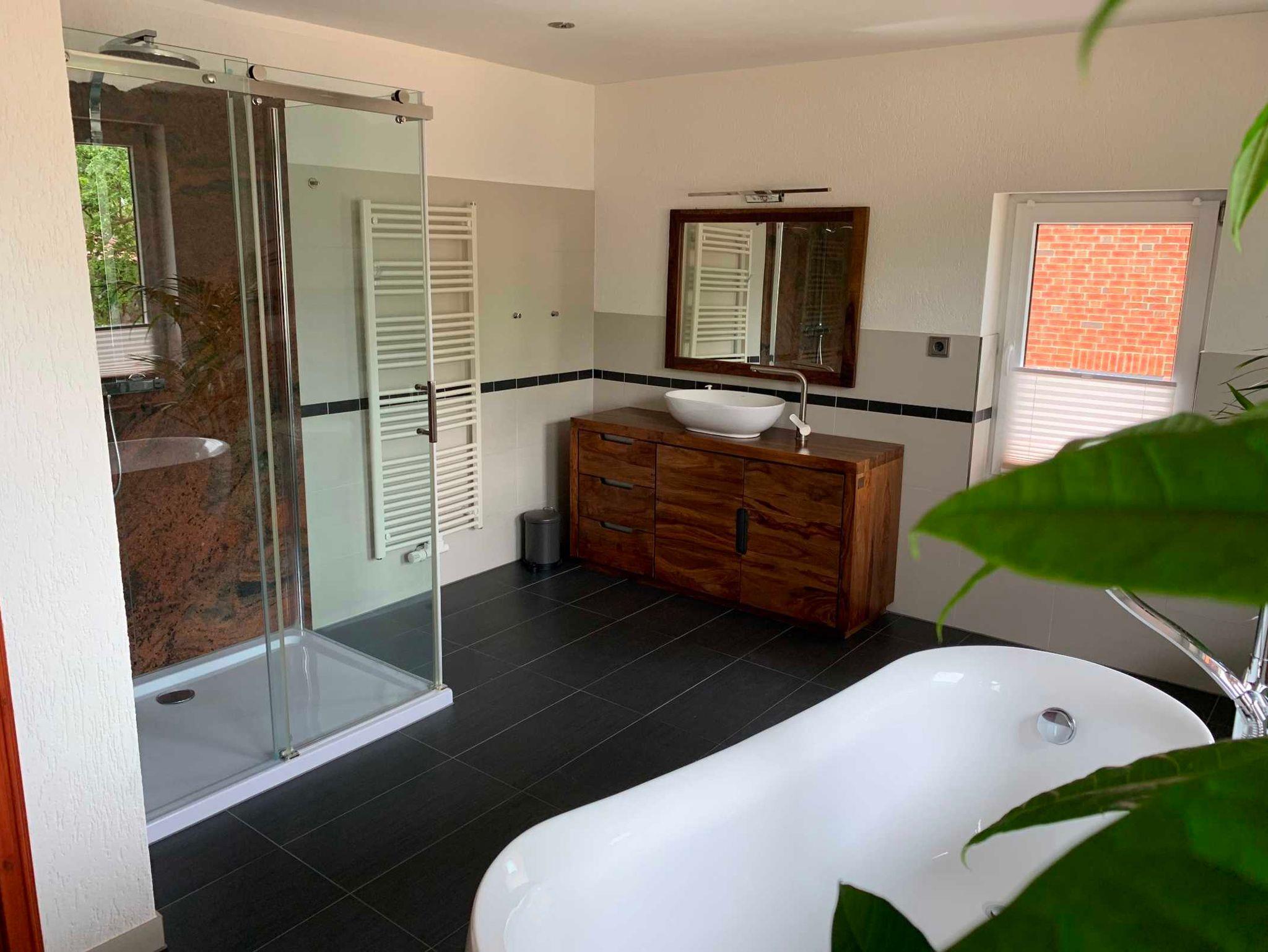 …setzt sich im Obergeschoss weiter fort. Dort befindet sich das 20 m² große Luxusbad mit Spa-Dusche und freistehender Wanne. Ein vollwertiges zweites Badezimmer ist im Erdgeschoss gelegen.