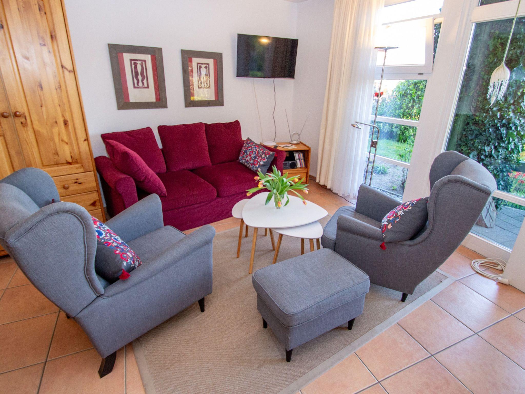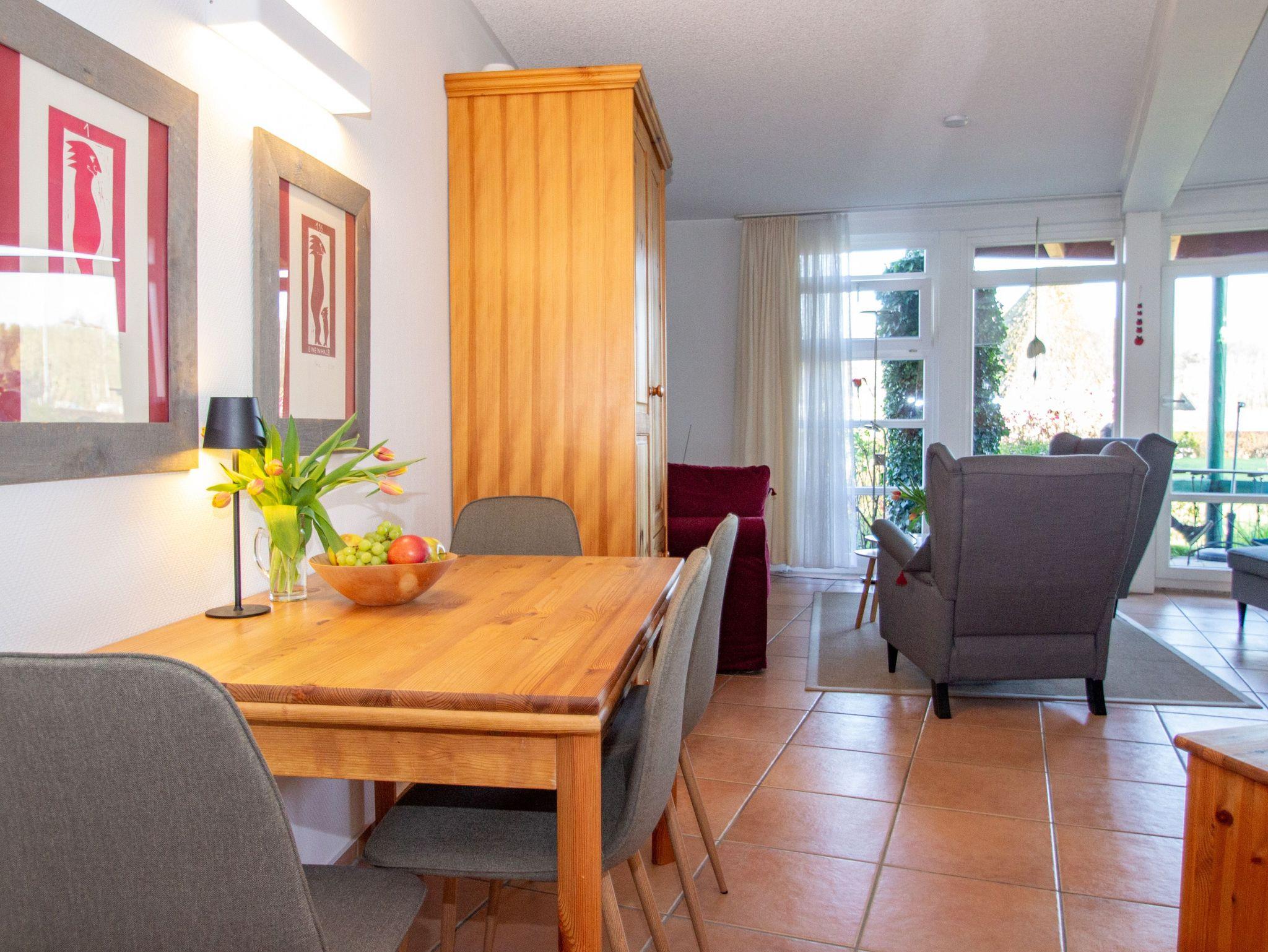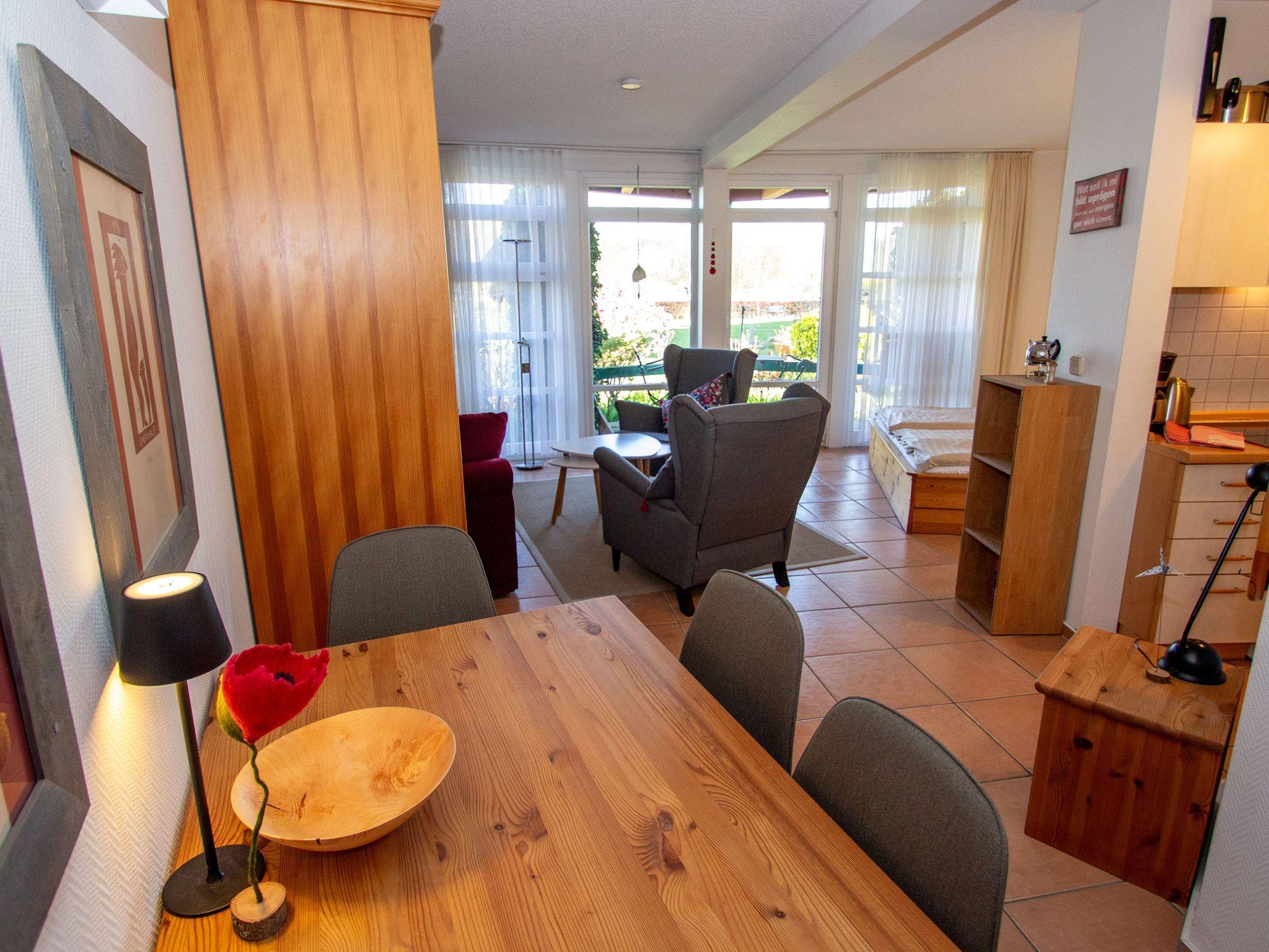 Das Apartement Hafenblick ist ein helles, liebevoll gestaltetes Ein-Raum-Appartement mit 45 m², das dir alles bietet, was du für eine entspannte Auszeit brauchst. Die Südausrichtung, bodentiefen Fenster und eine überdachte Terrasse sorgen den ganzen Tag für Licht, Weitblick und Wohlgefühl. Der kombinierte Wohn-Schlaf-Bereich ist gemütlich eingerichtet und verfügt über ein großes Doppelbett (180x200, getrennten Matratzen) sowie eine Schlafcouch (180x200), die sich für bis zu zwei weitere Personen eignet. Ein ausziehbarer Esstisch bietet Platz für bis zu vier Gäste und das bequeme Mobiliar lädt zum Lesen, Entspannen oder einfach zum Genießen der wunderbaren Aussicht ein. Die kleine, voll ausgestattete Küchenzeile bietet alles, was du für die Selbstversorgung brauchst: vom Kochfeld über Kühlschrank bis zur Kaffeemaschine. Alternativ kannst du dich auch in den umliegenden Restaurants verwöhnen lassen oder ein Frühstück vor Ort buchen. Das Bad ist mit einer ebenerdigen Dusche und WC ausgestattet.