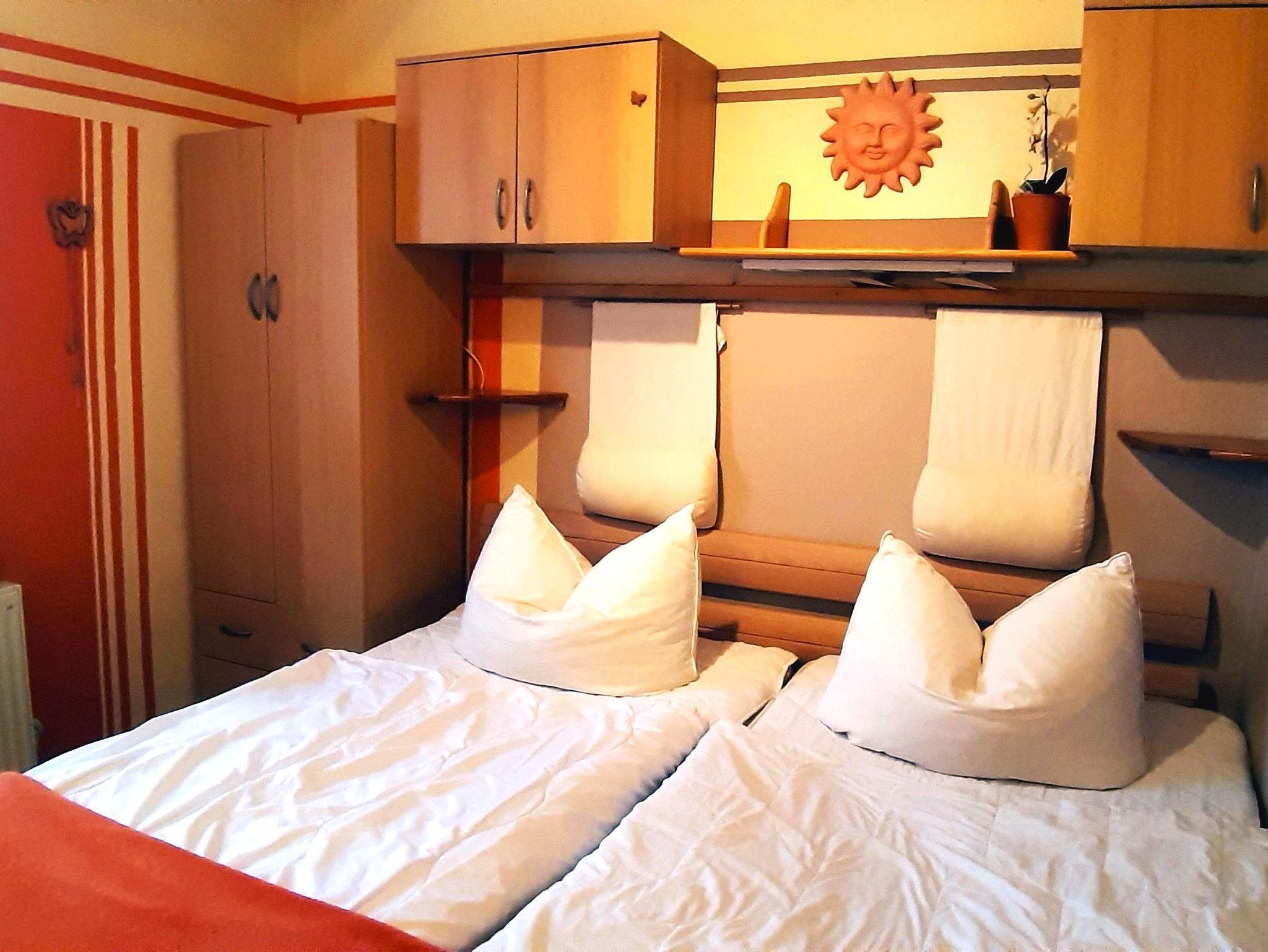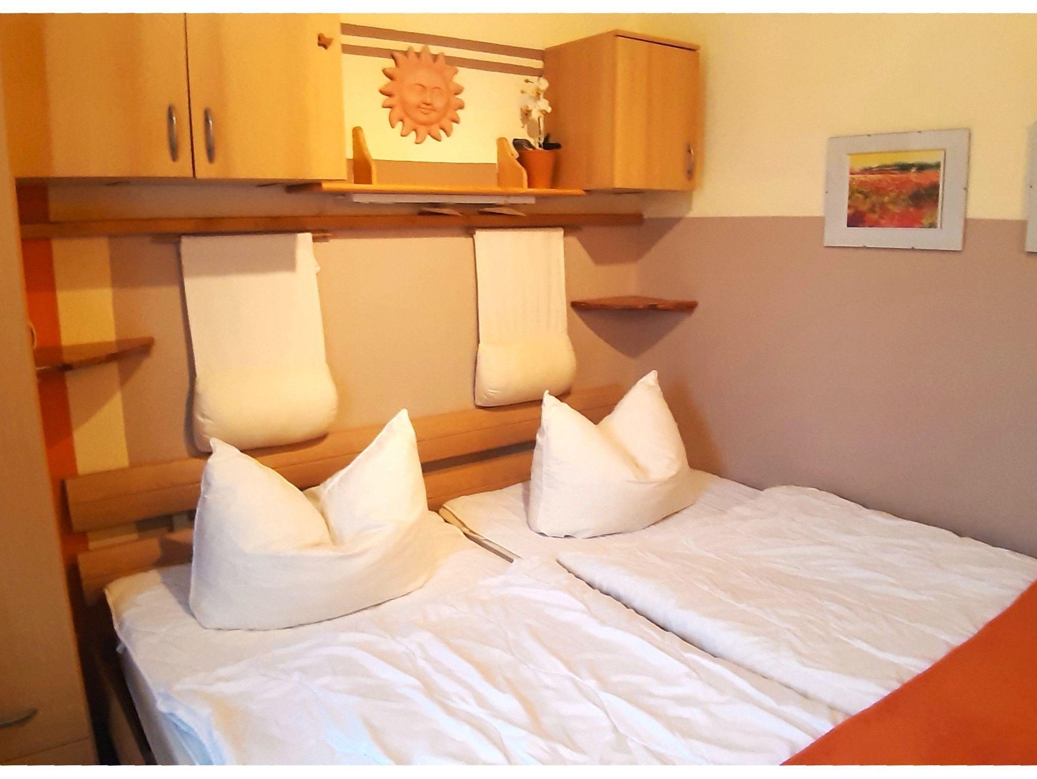 Das Schlafzimmer ist mit einem Doppelbett (1,80x2,00 m), 2 Hängeschränken, einem Kleiderschrank , einer Garderobe und einem Spiegel ausgestattet.