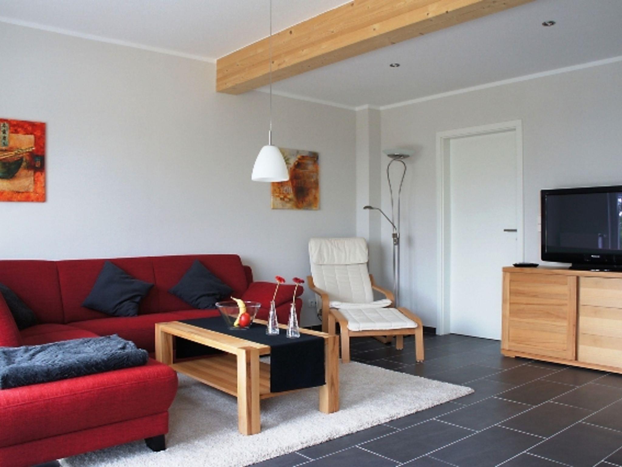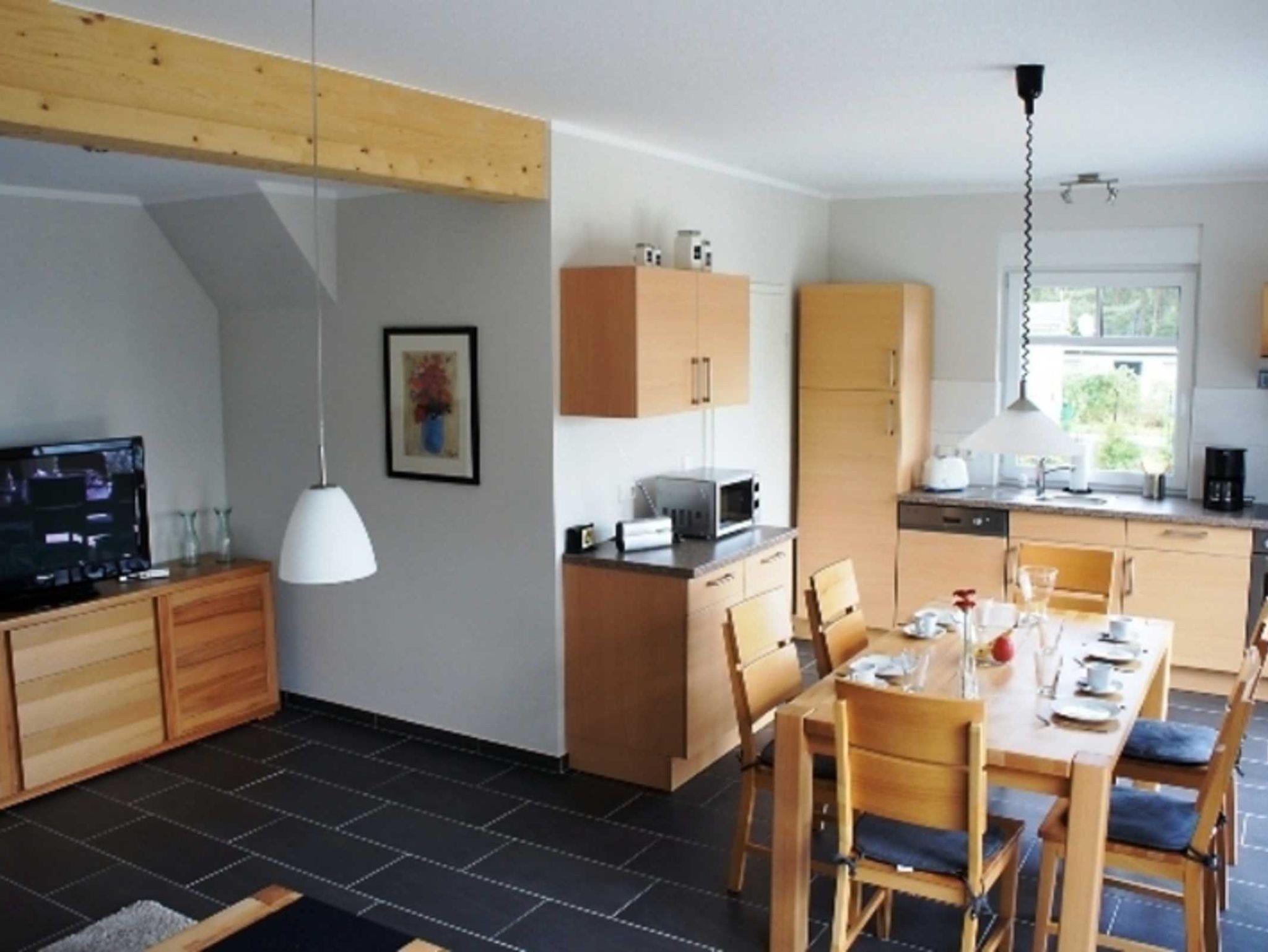 Im Erdgeschoss steht Ihnen ein Wohn/Esszimmer mit einer SAT-TV Anlage, großem Plasma Flachbildschirm (94cm) und Stereo-Kompakt-Anlage zur Verfügung. Eine offene Küche ( mit E-Herd und Backofen, Kaffeemaschine, Wasserkocher, Mikrowelle, Toaster, großem Kühlschrank/Gefrierfach, Mixer und Geschirrspüler, 1 Kinderhochstuhl) lädt zum gemeinschaftlichen Kochen und Genießen ein. Ebenfalls im Erdgeschoss befinden sich 1 Schlafzimmer (zwei Betten je 2 x1m) , 1 modernes Bad mit bodengleicher Dusche, Waschtisch und WC und Waschmaschine. Eine große Terrasse mit 6 Stühlen, Tisch, Sonnenschirm und Grill befindet sich direkt am Ferienhaus.