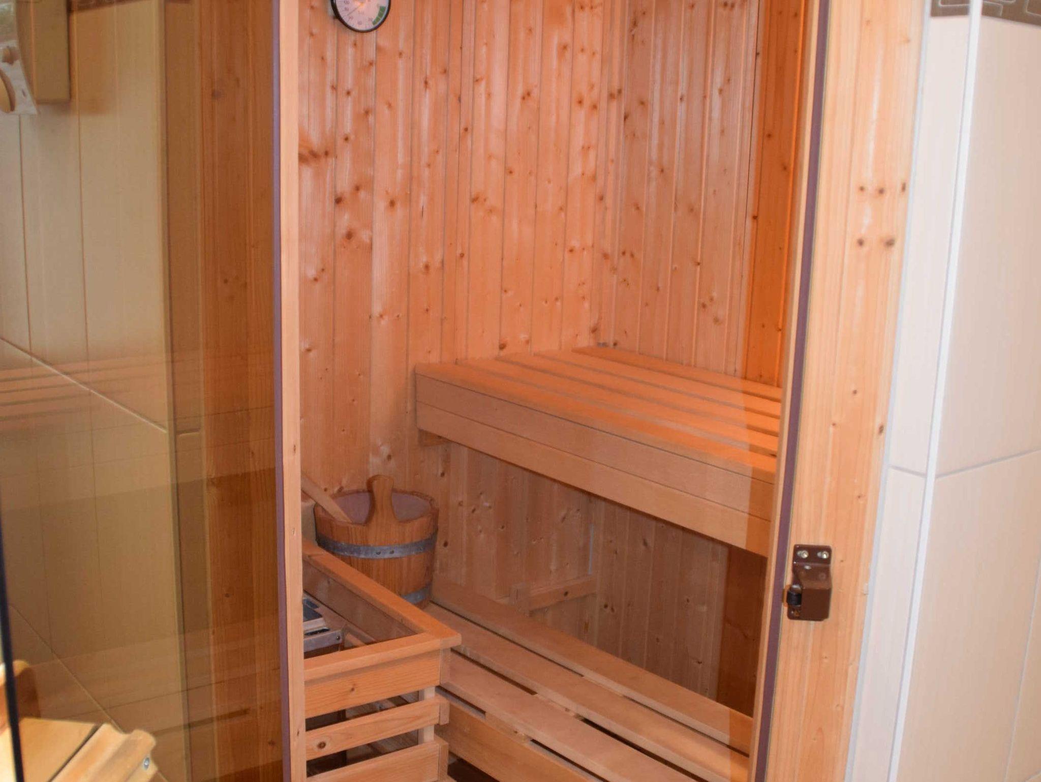 Im EG befindet sich ein Duschbad mit Sauna und die Küche mit Wohn -und Essbereich und einem Kamin.
