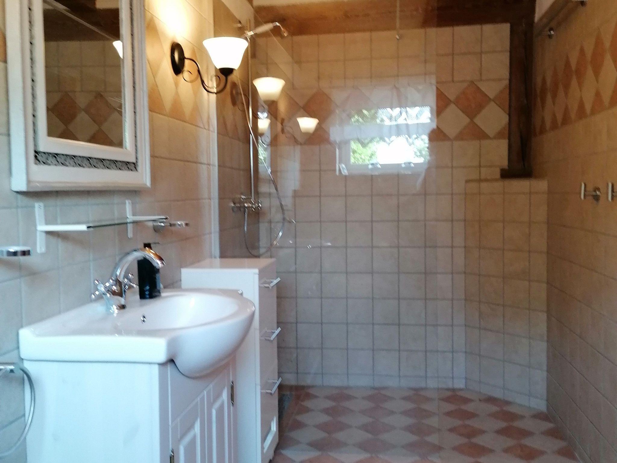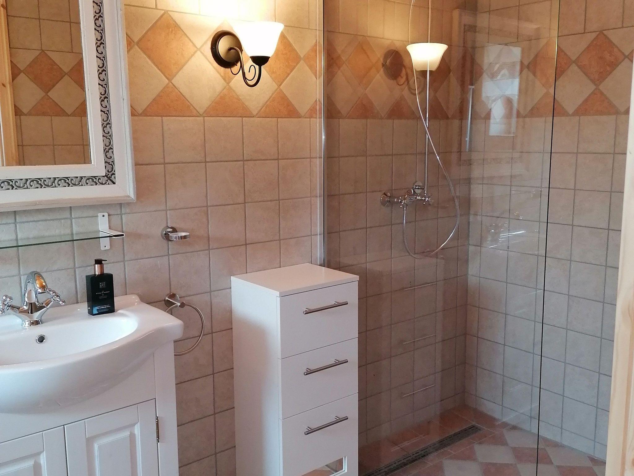 Die Fußbodenheizung lässt auch kältere Tage warm ausklingen. Das schöne Badezimmer verfügt über eine ebenerdige, großzügige Dusche.