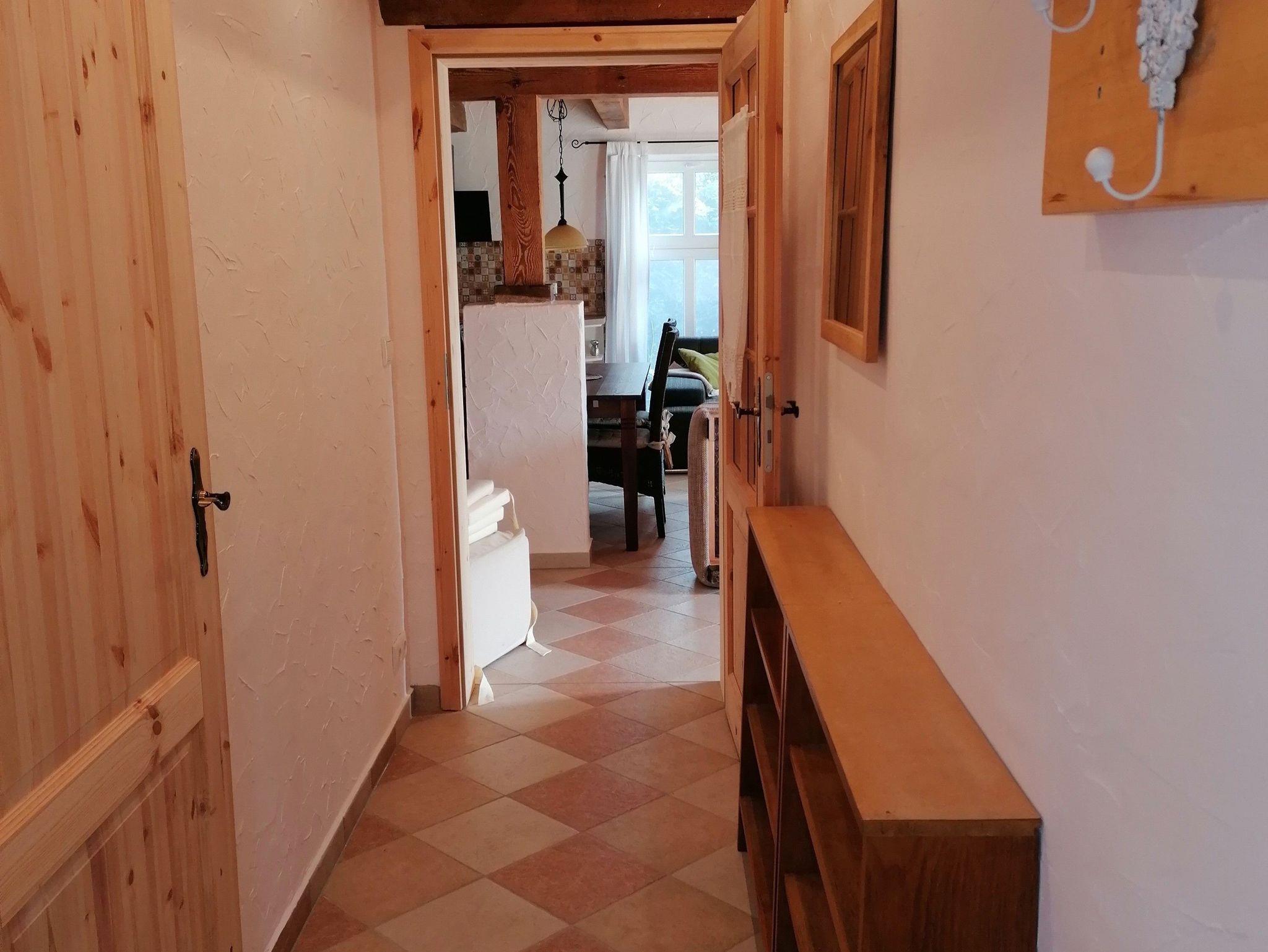 Die 80 m² große Ferienwohnung (für max. 6 Erwachsene und 1 Kleinkind bis 3 Jahre-Kinderreisebett) im mediterranen Flair mit Holzkonstruktion und Fliesen besitzt einen Wohnraum mit offener Wohnküche und 1 Aufbettungsmöglichkeit (Schlafsofa), 1 SZ mit Doppelbett, 1 SZ mit Doppelbett und 1 Schlafcouch, einem Bad mit ebenerdiger Dusche.Die offene Wohnküche ist voll ausgestattet und lädt zum Kochen und Verweilen ein.