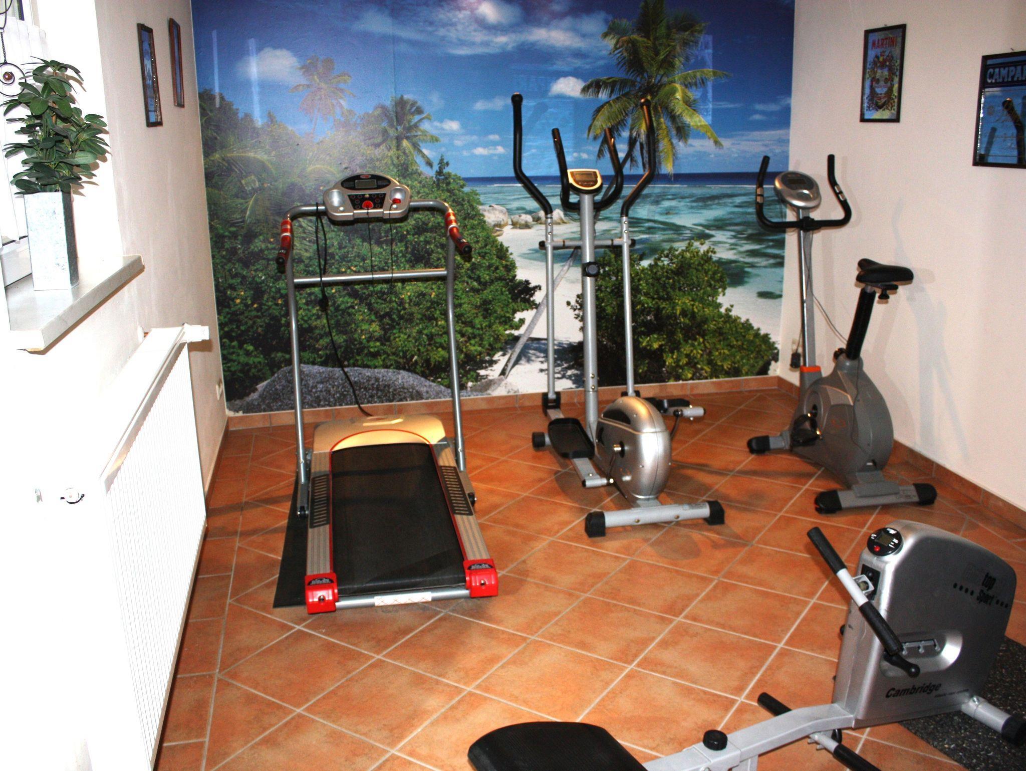 Keller: Flur, 1 Raum für Fitness mit Laufband, Crosstrainer, Ergometer und Rudergerät, 1 Raum mit Sauna, Dusche und Waschbecken, Waschmaschine und Trockner, 1 Raum mit 2 Liegen und Sat-TV zum Entspannen nach Sauna und Fitness. W-LAN ist vorhanden.