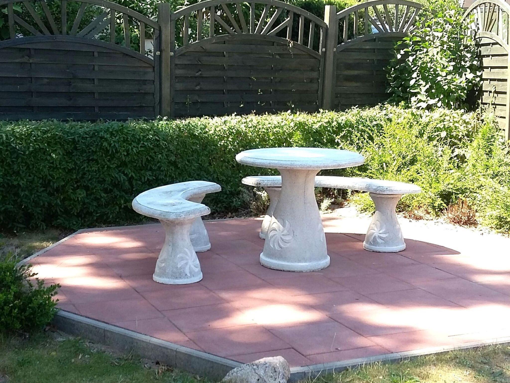 Die großzügige Südwest-Terrasse mit Blick über einen Naturschutzgürtel zum See hat zusätzlich zu Gartenmöbeln (8 Stühle u. Tisch) , 4 Liegen, Sonnenschirm und Kamingrill einen transparenten Windschutz im Sitzbereich. Eine 2.Terrasse befindet sich auf der anderen Seite des Hauses, geschützt durch Hecke und Sichtschutz, ausgestattet mit einer Steingarnitur im mediteranen Stil.