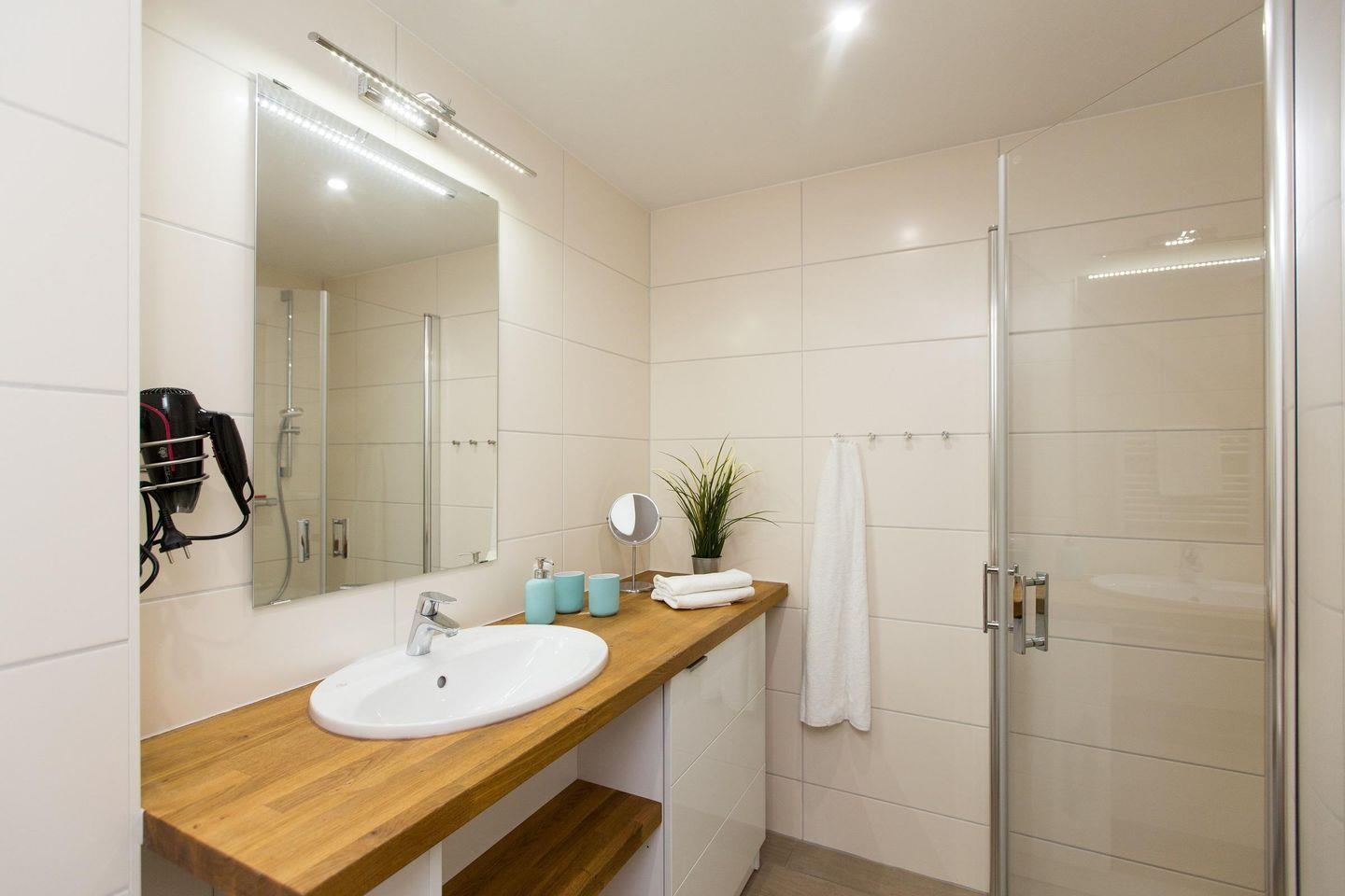 ein separates Schlafzimmer und ein Duschbad auf. Das Badezimmer ist mit einer Waschmaschine