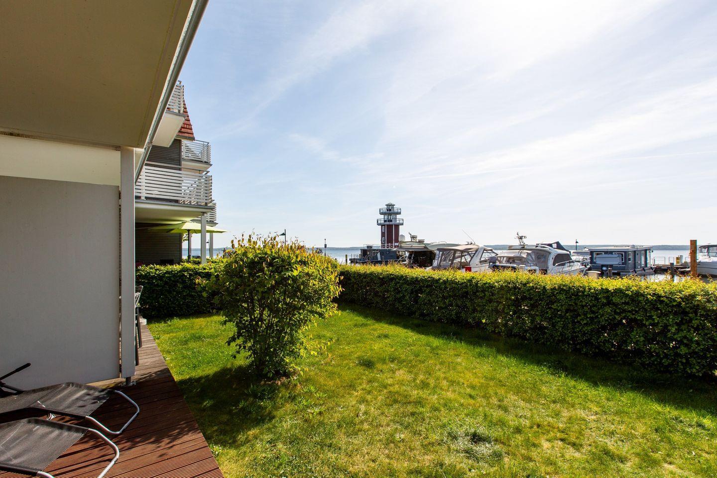 Der direkte Blick auf den Hafen und den dahinter liegenden See vermittelt ein maritimes Flair.