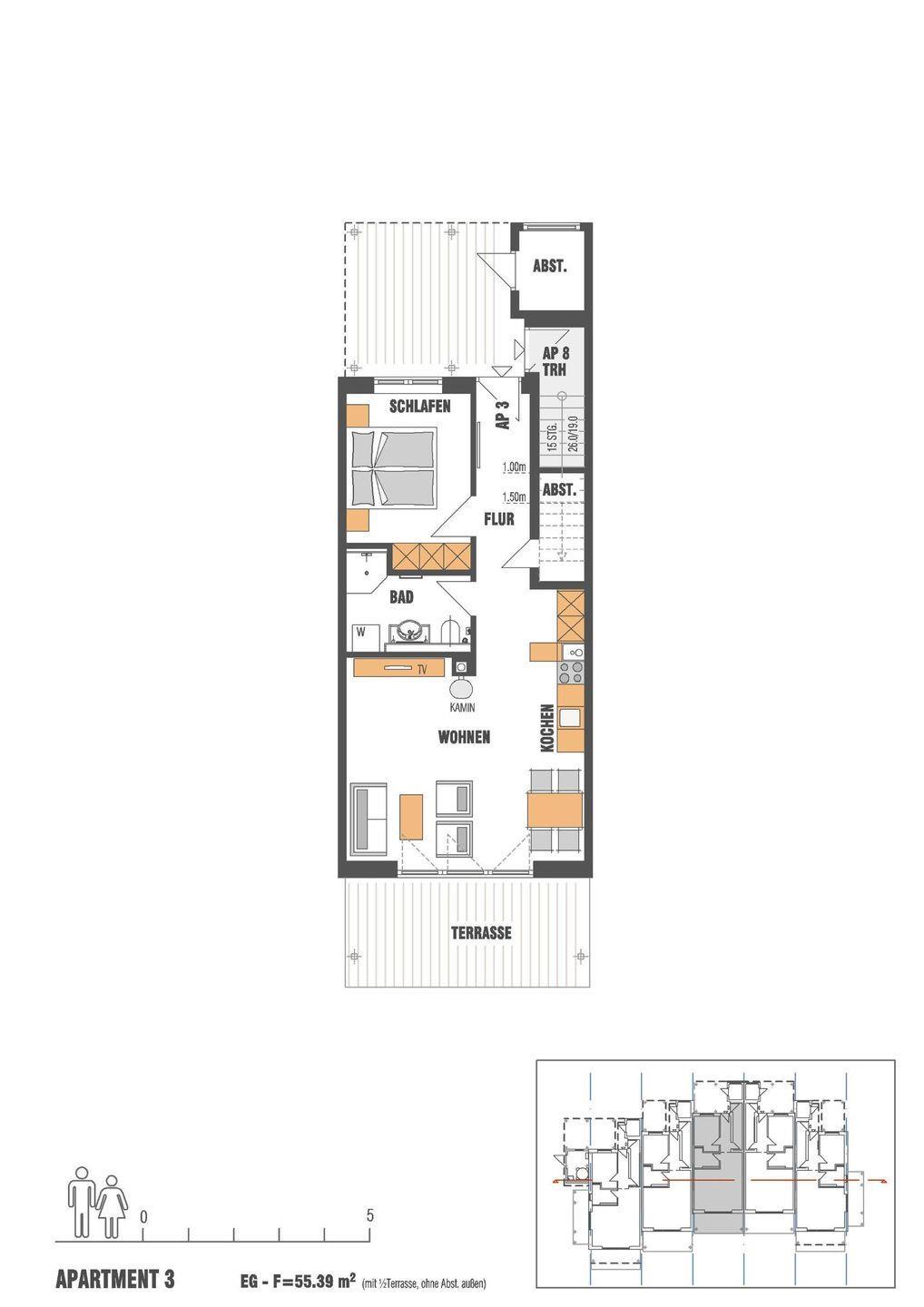 Die Wohnfläche von 56 m² teilt sich in einem Wohn-/Essbereich mit einer Küchenzeile, einem separaten Schlafzimmer und einem Duschbad auf.