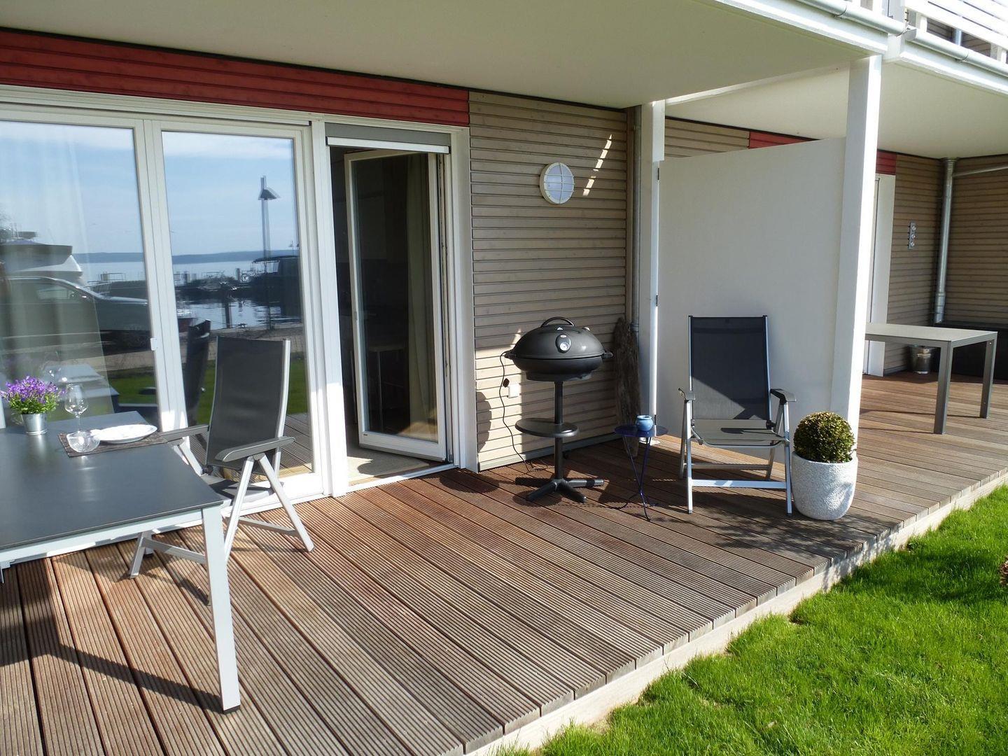 Die Terrasse mit Grünfläche ist nach Süden ausgerichtet und einem Tisch, vier Stühlen