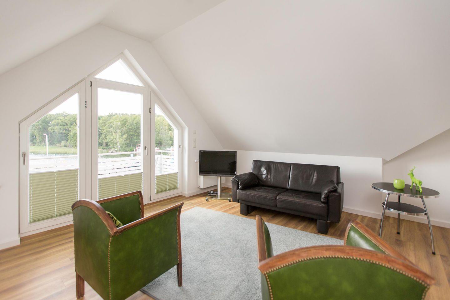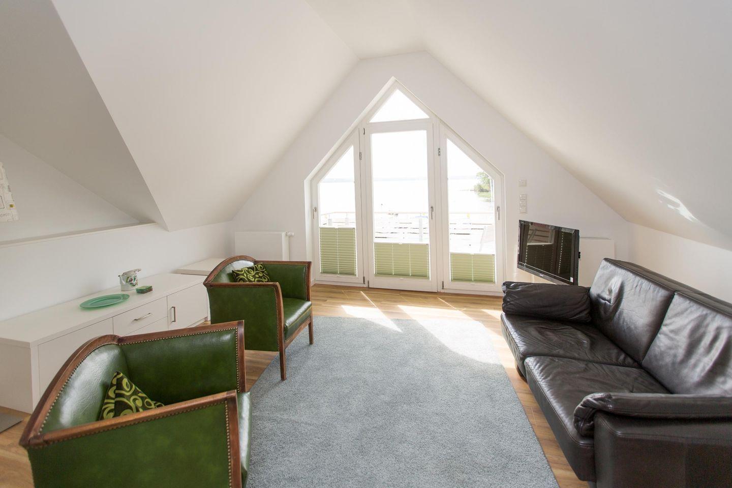 Im Dachgeschoss mit seiner besonderen Höhe und Dachschrägen ist das Wohnzimmer mit TV, Zugang zum 2. Balkon und Möglichkeit zur Aufbettung (1-2 Personen) . Ein guter Ort zum Rückzug, gemütliches Lesen oder Fernsehen. Oder Sie sitzen einfach da und lassen sich vom Panoramablick überwältigen.