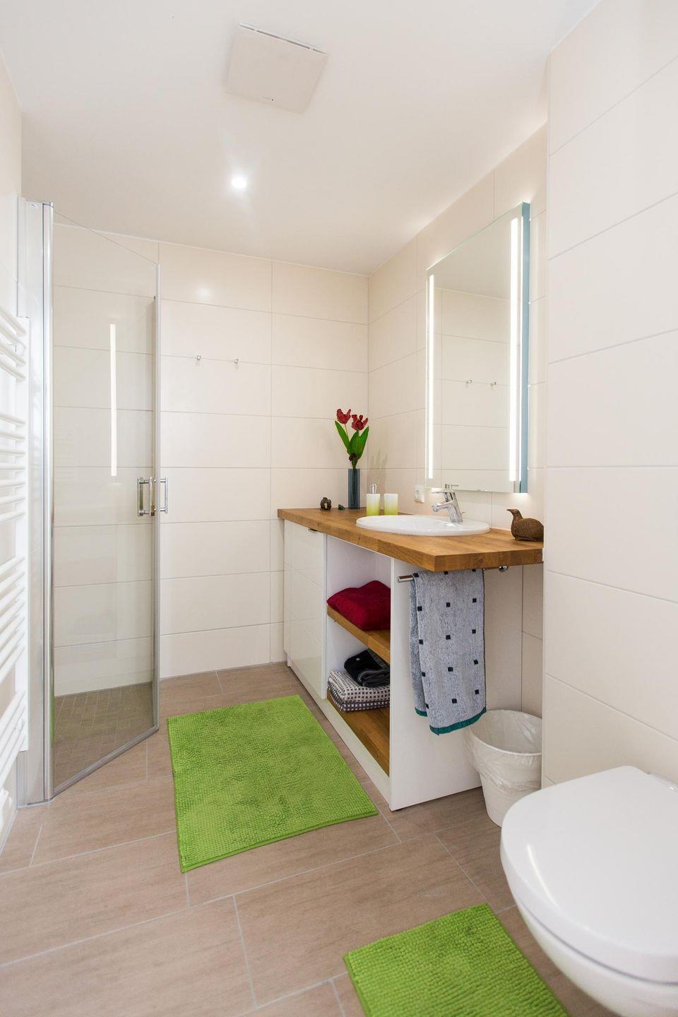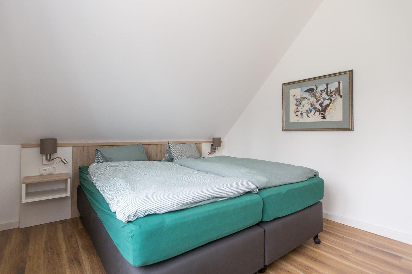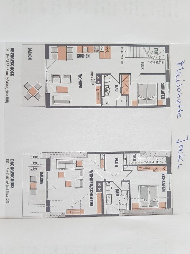 Im Obergeschoss befindet sich als Dreh-und Angelpunkt der Wohn- Essbereich mit Küchenzeile, Kaminofen (ab 09/2018) und Zugang zum 12 m² großen Balkon.Hier auch ein geräumiges Bad mit bodengleicher Dusche, Waschmaschine und Föhn und das Schlafzimmer mit Boxspringbett (1,80 m x 2,00 m) und Fernseher.